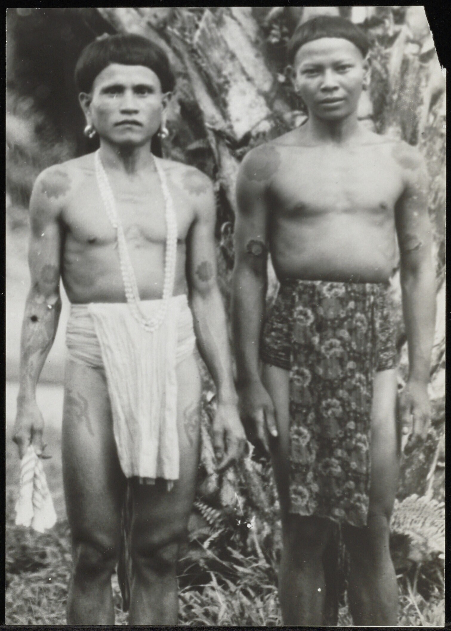 Groepsportret van getatoëerde Batang Lupar Dayak mannen in lendendoek