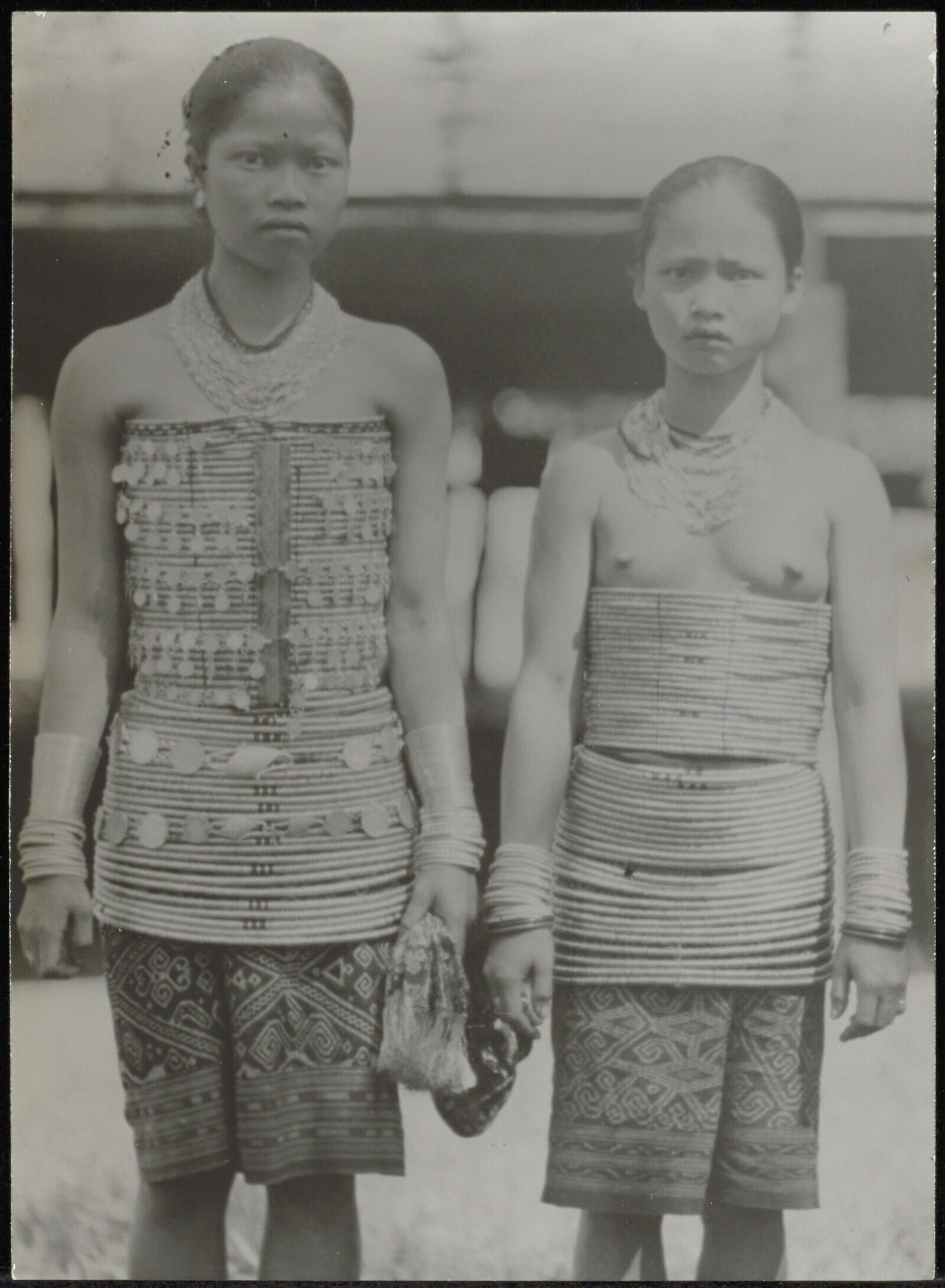 Groepsportret van twee Dayak meisjes met kledingstukken van bamboe ringen en katoenen ikat sarong