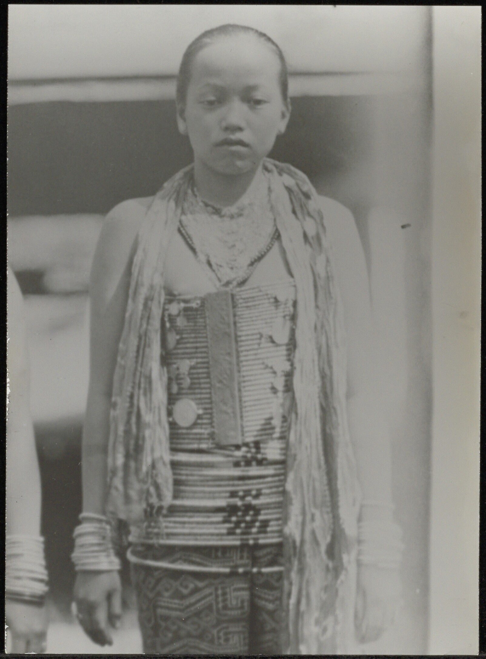 Groepsportret van een Dayak meisje met een kledingstuk van bamboe ringen en een ikat sarong