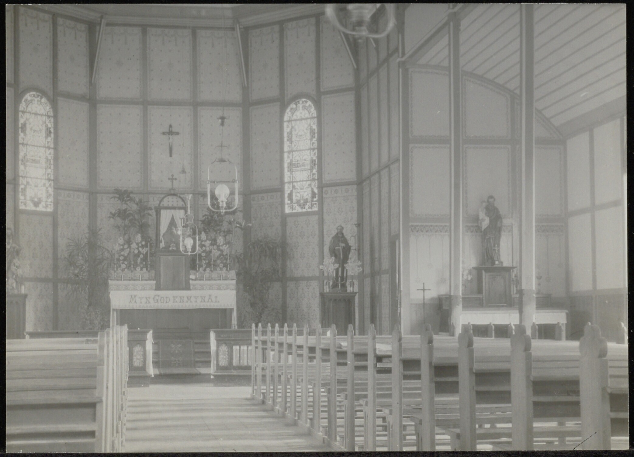 Interieur van de rooms-katholieke kerk in de missiestatie Nanga Sedjiram