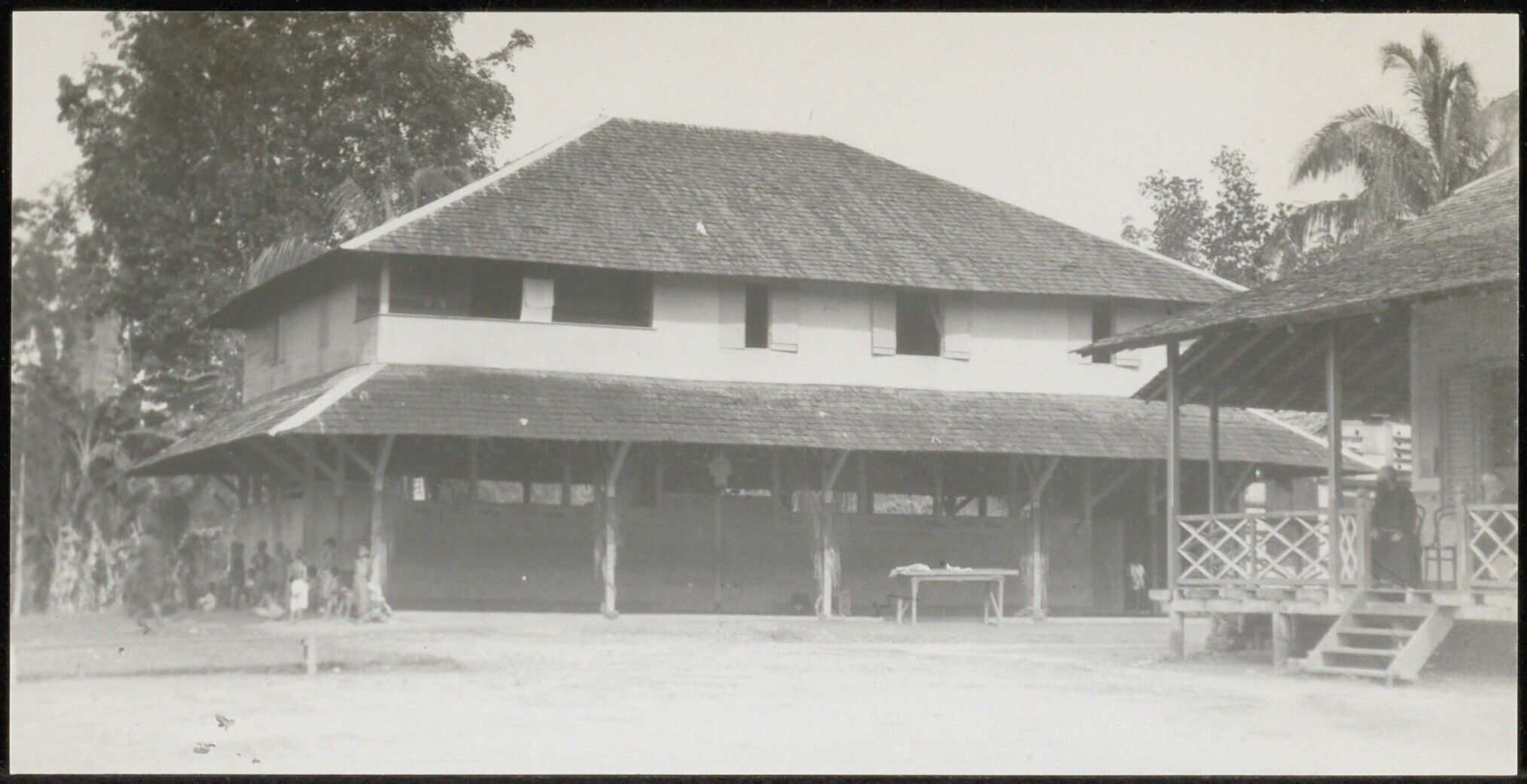 Gezicht op gebouwen in de missiestatie Nanga Sedjiram met rechts het priesterhuis