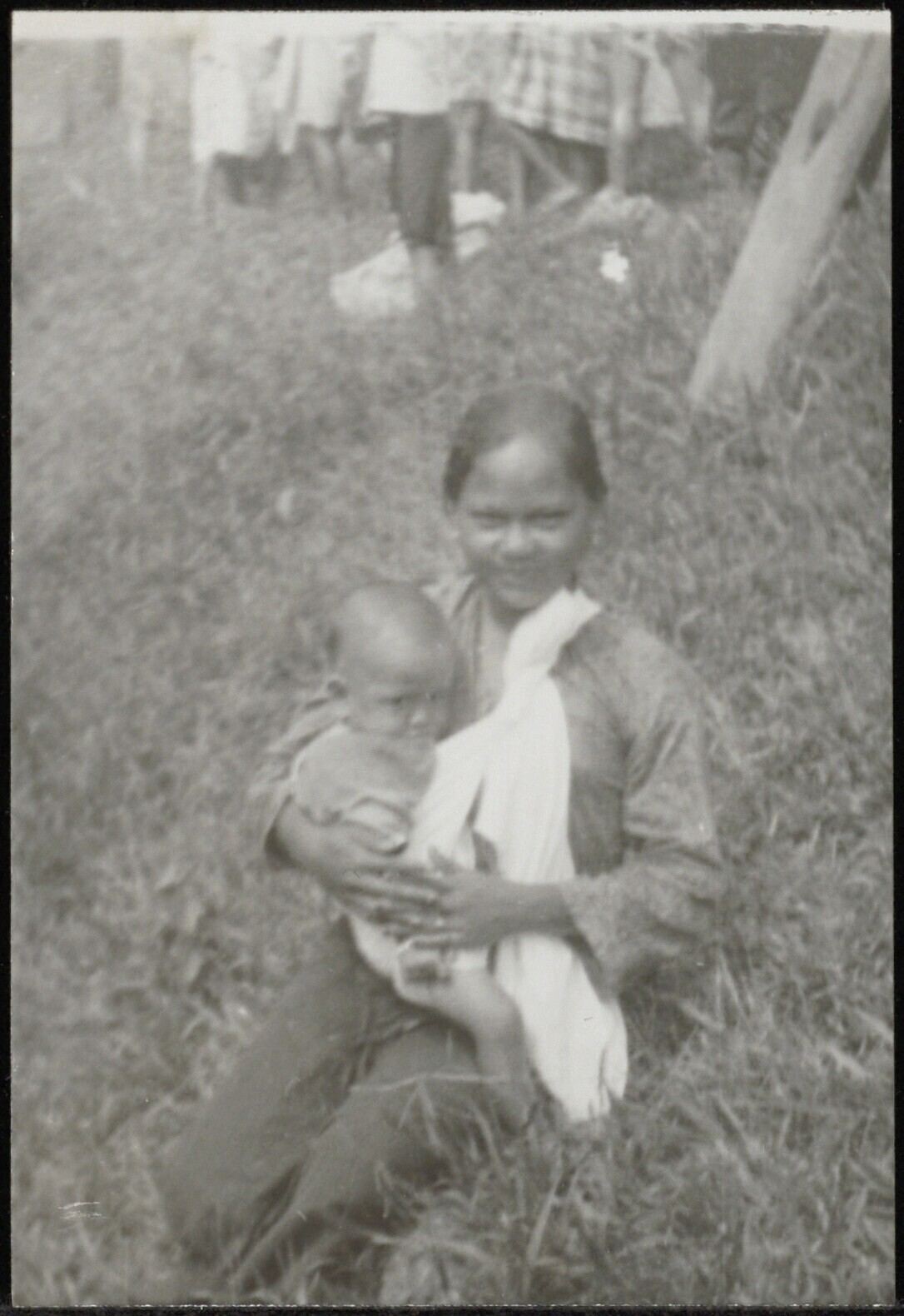 Portret van een vrouw met een kind op de arm bij de missieschool in Nanga Sedjiram
