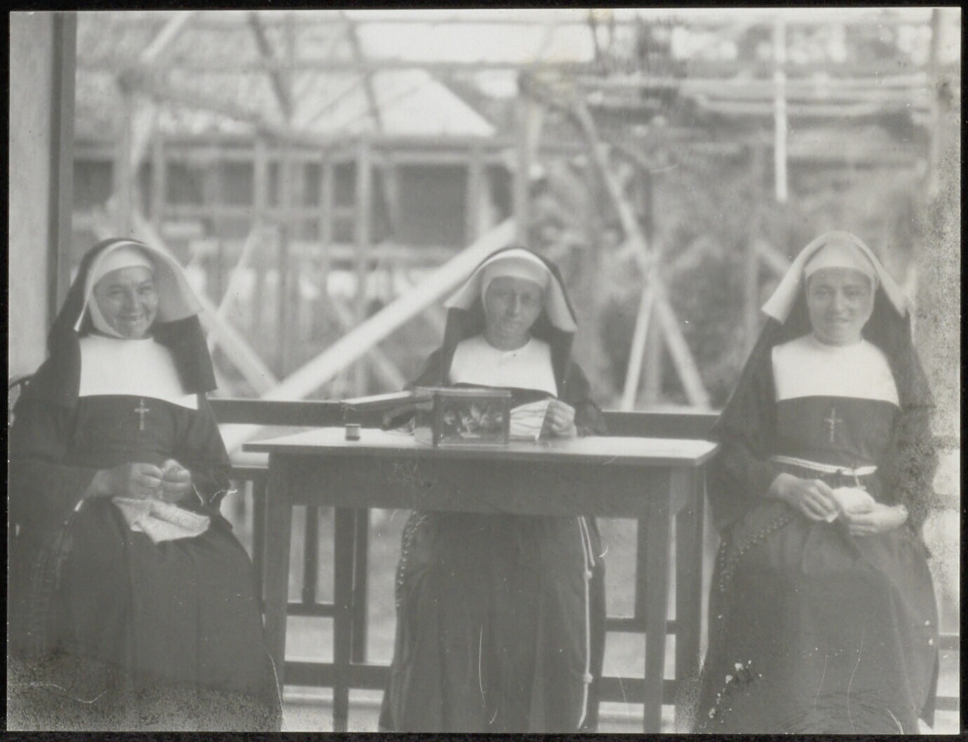Groepsportret van handwerkende nonnen in de rooms-kathoklieke missiestatie te Nanga Sedjiram
