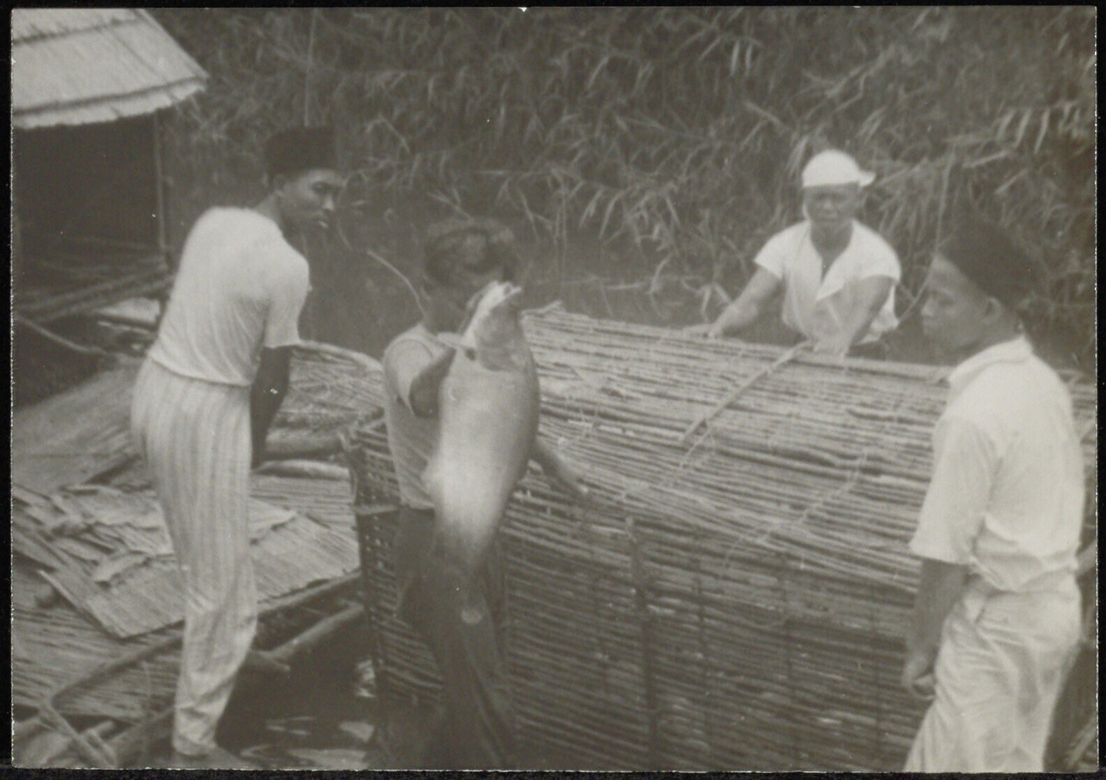 Mannen bezig met het leeghalen van fuiken op een vlot langs de Kapuas-rivier