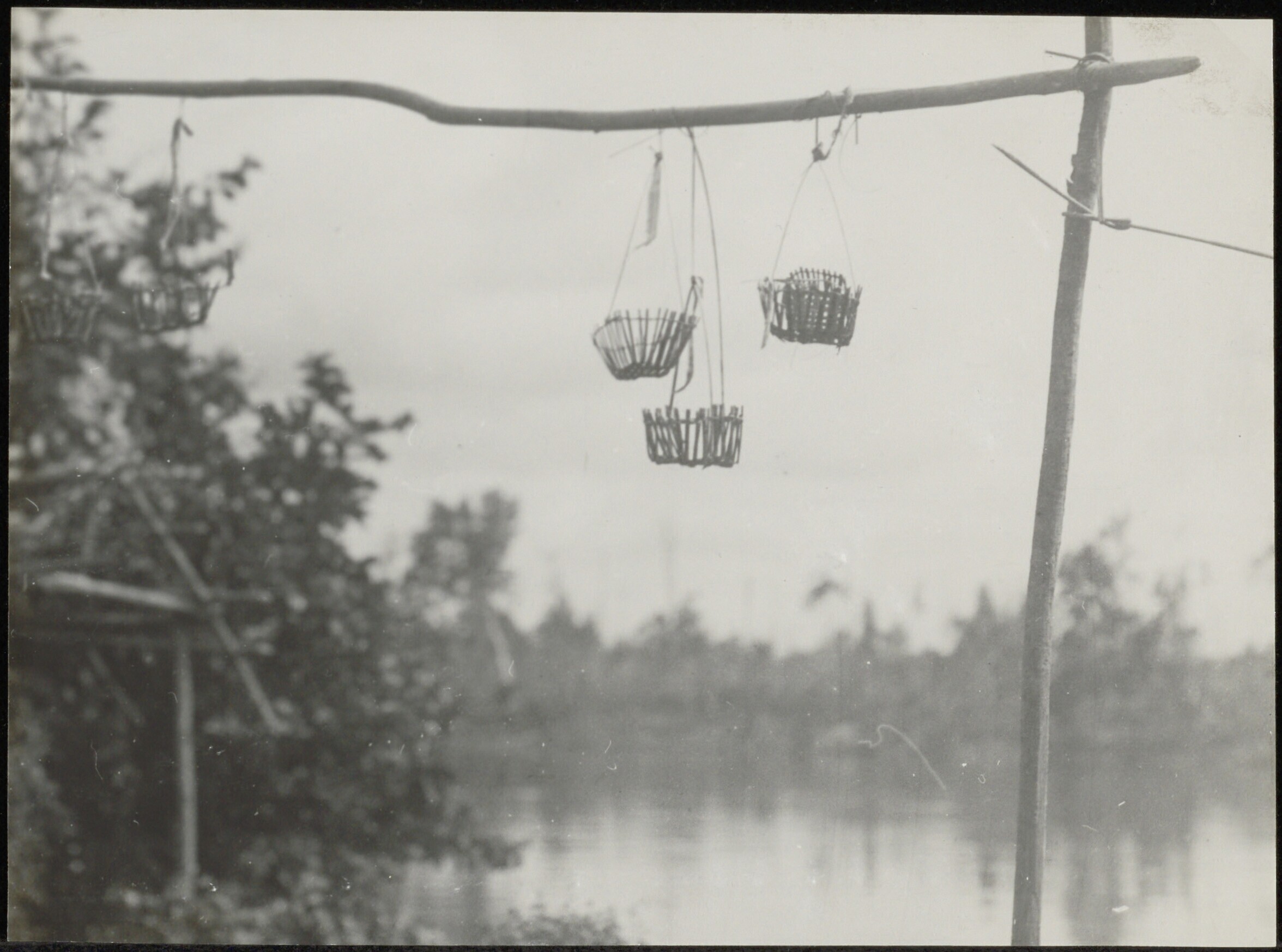 Mandjes aan stokconstructie in Poetoes-Sibau op West-Borneo