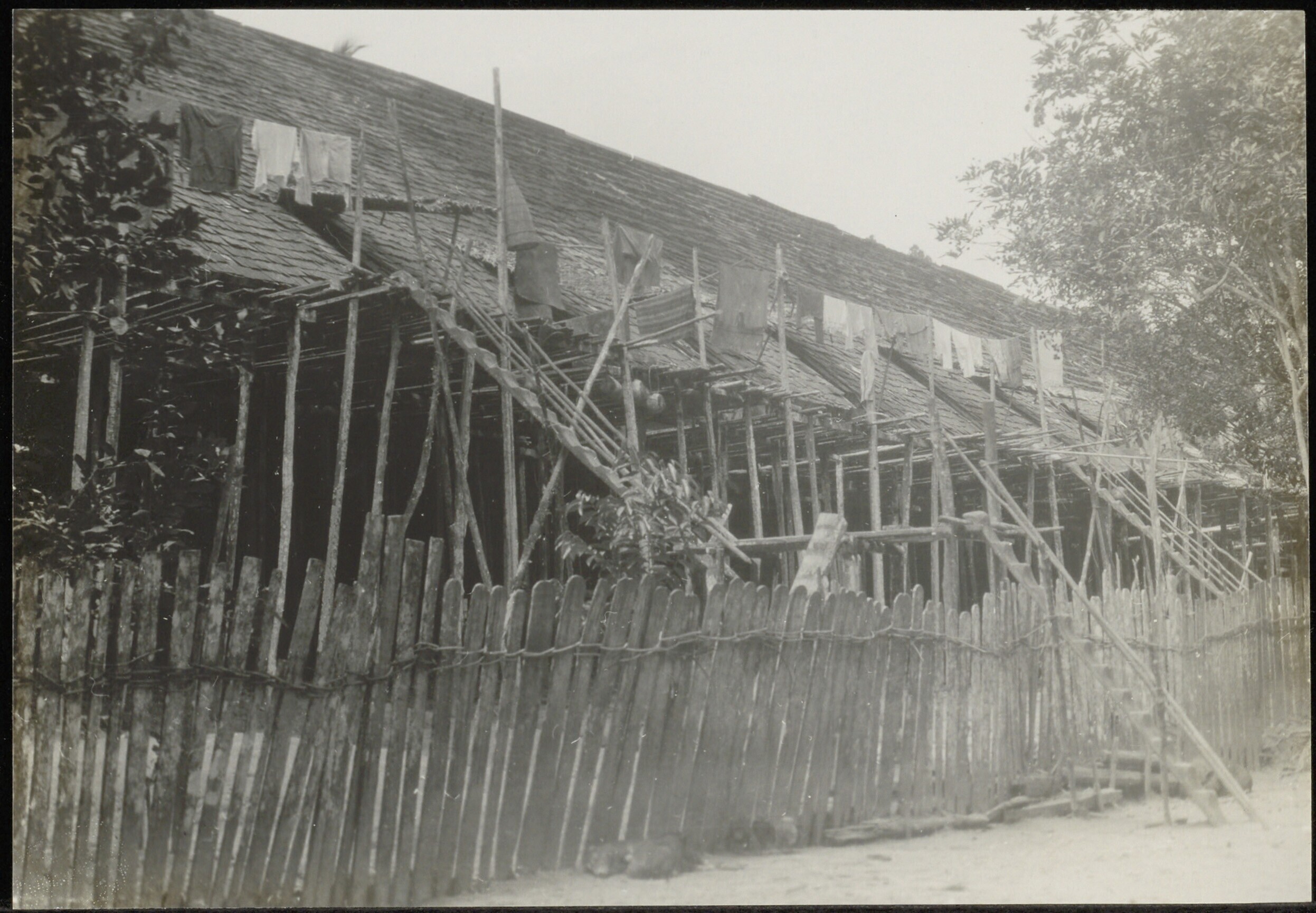 Gezicht op een Dayak huis met palenconstructie en gespannen drooglijnen