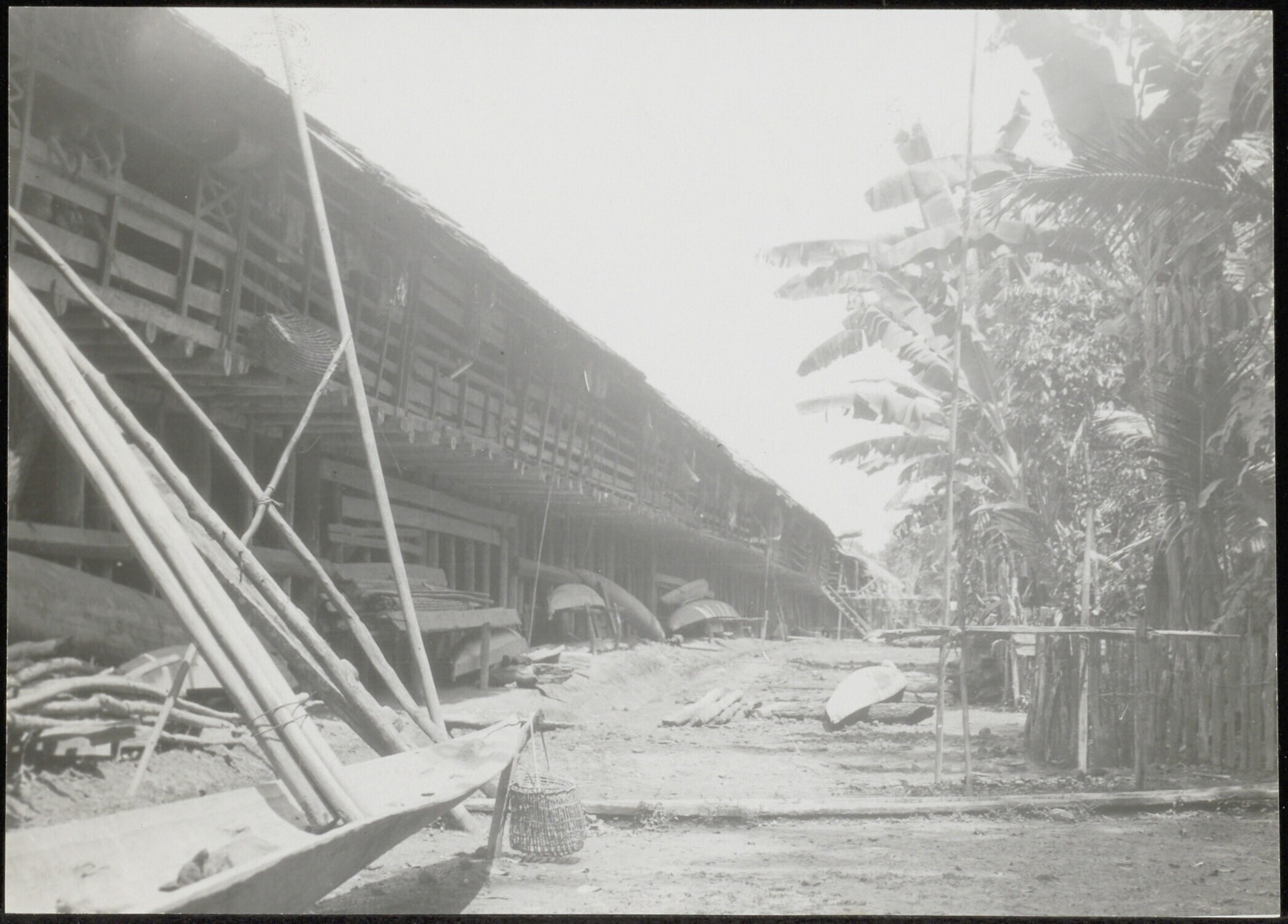 Gezicht op de behuizing van Dayaks met botenloods