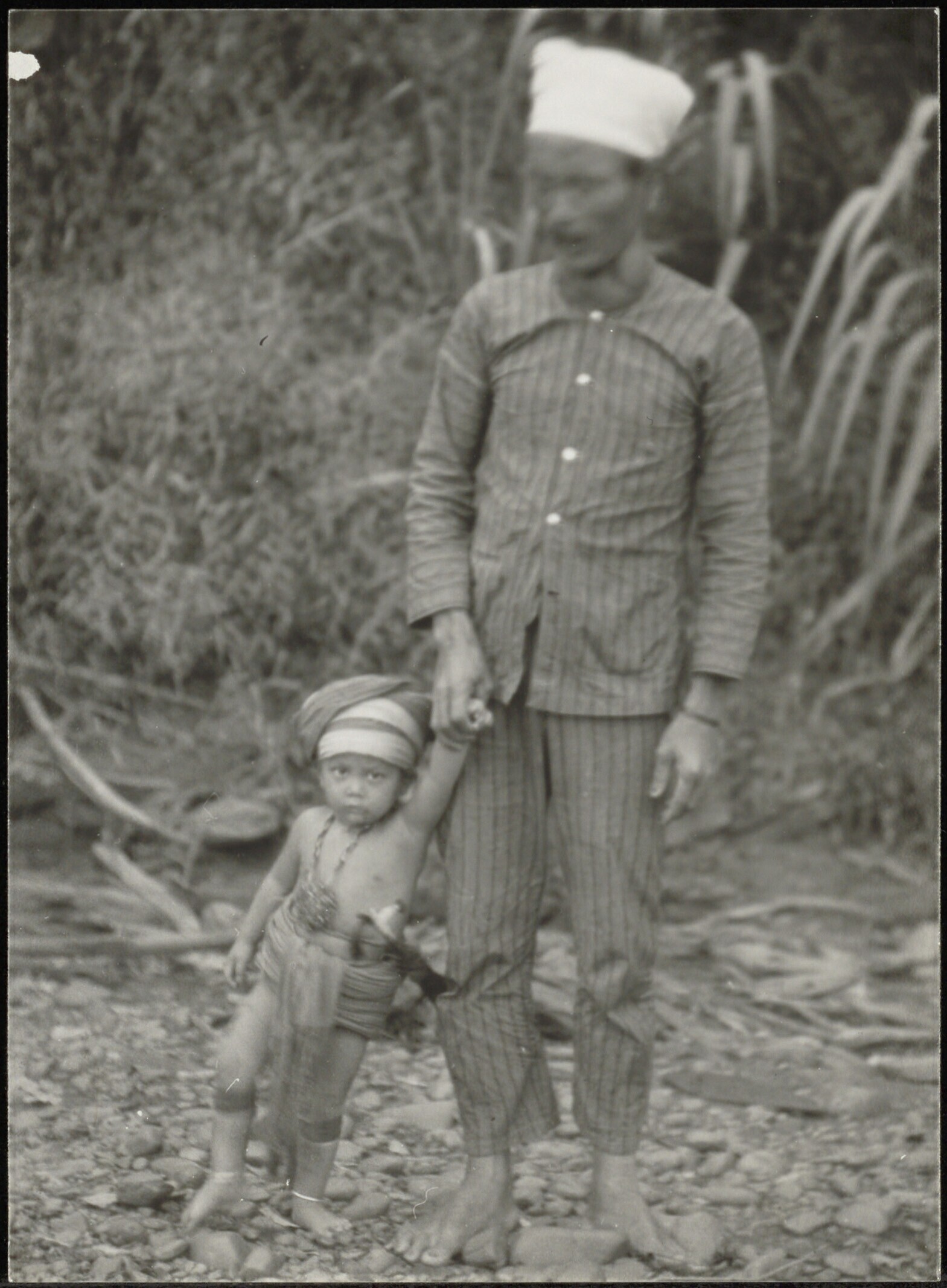 Groepsportret van het zoontje van de Kayan Dayak man Tigang met verzorger