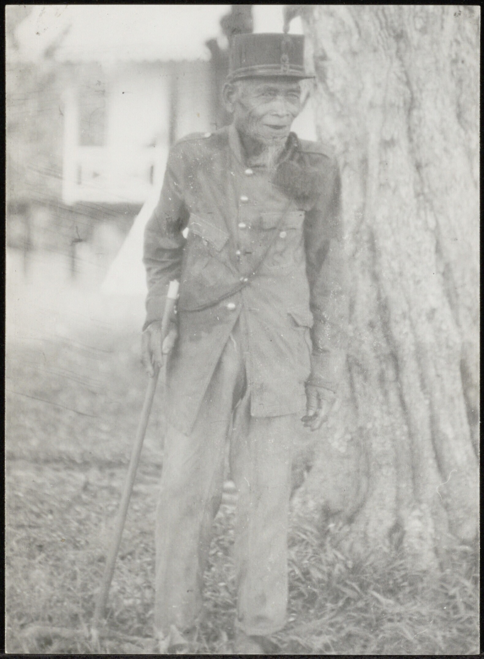Portret van een bejaarde Dayak met uniformjas en kepi