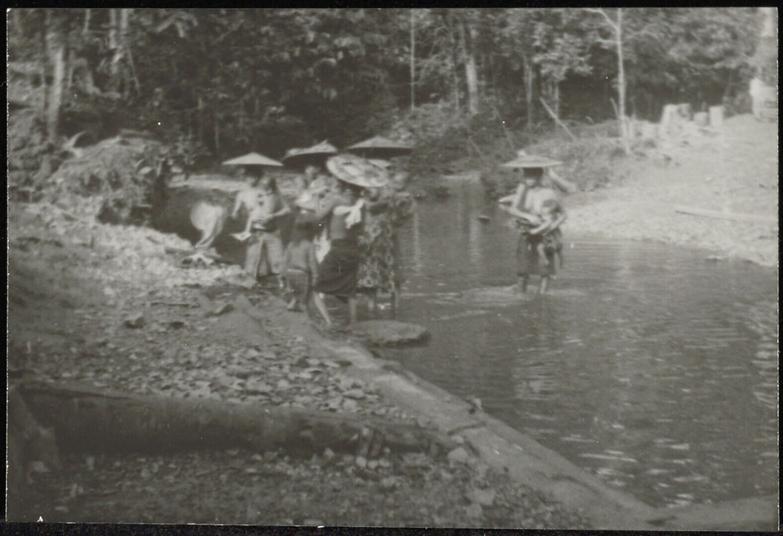Gezicht op een was- en badplaats aan de rivier