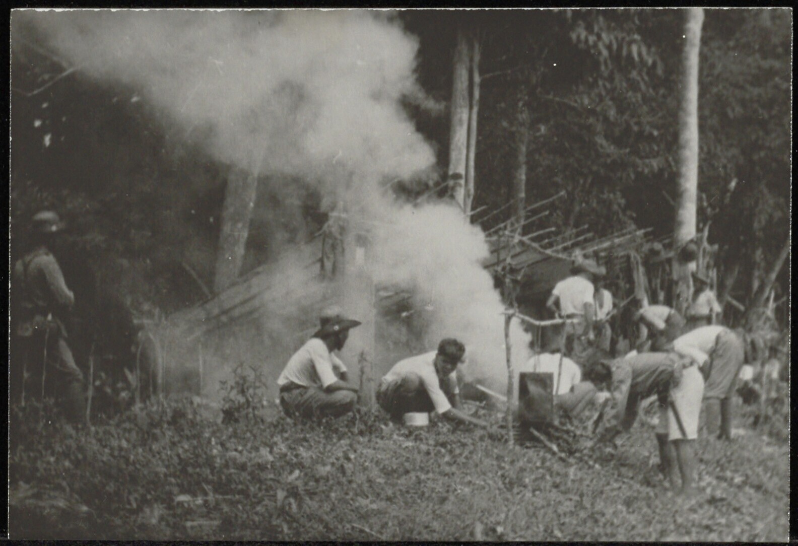 Voedsel bereiden in militair kampement aan de oever van de Kapuas-rivier