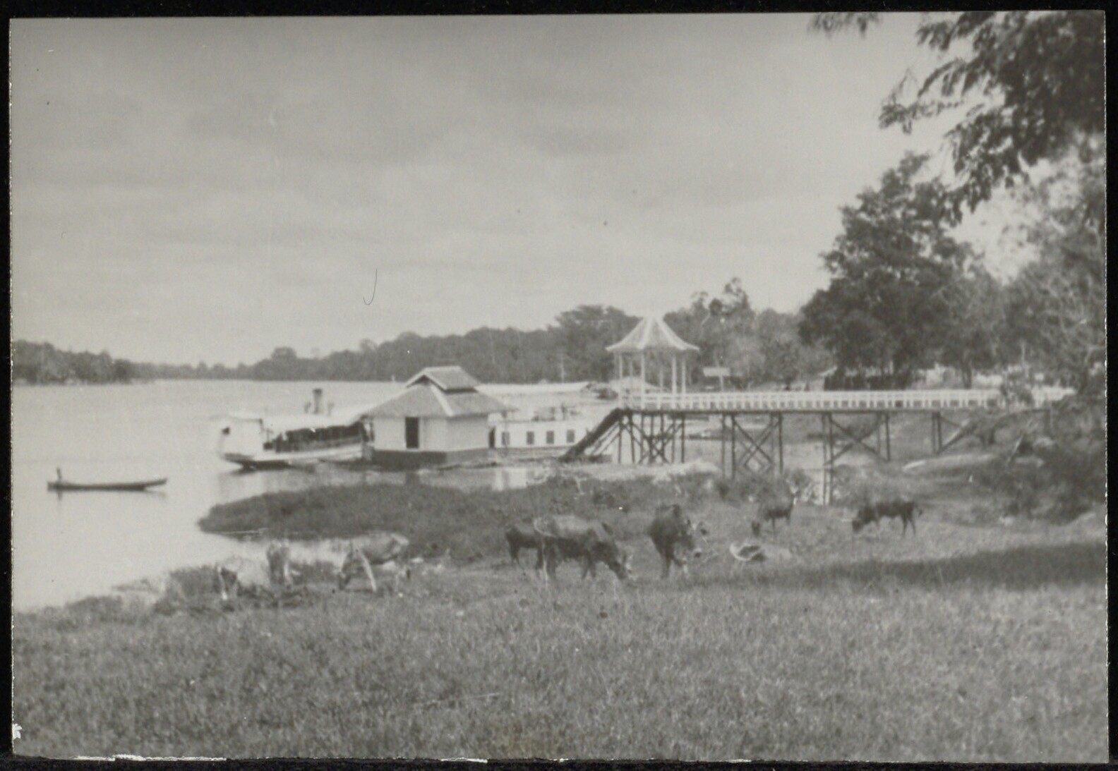 Grazende karbouwen langs de oever van een meer ter hoogte van een aanlegsteiger