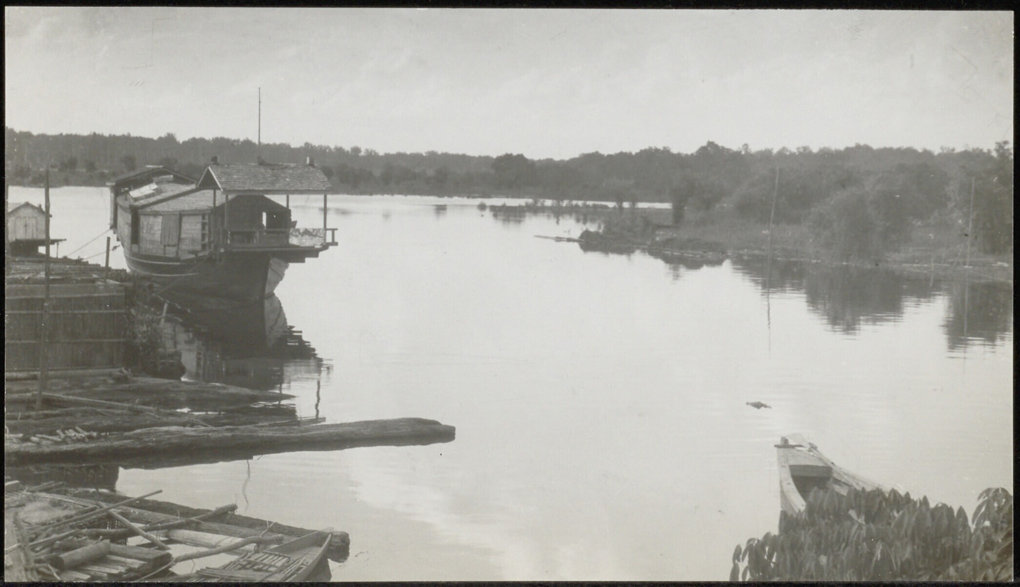 Boot gereed om af te meren bij aanlegplaats aan de oever van een meer
