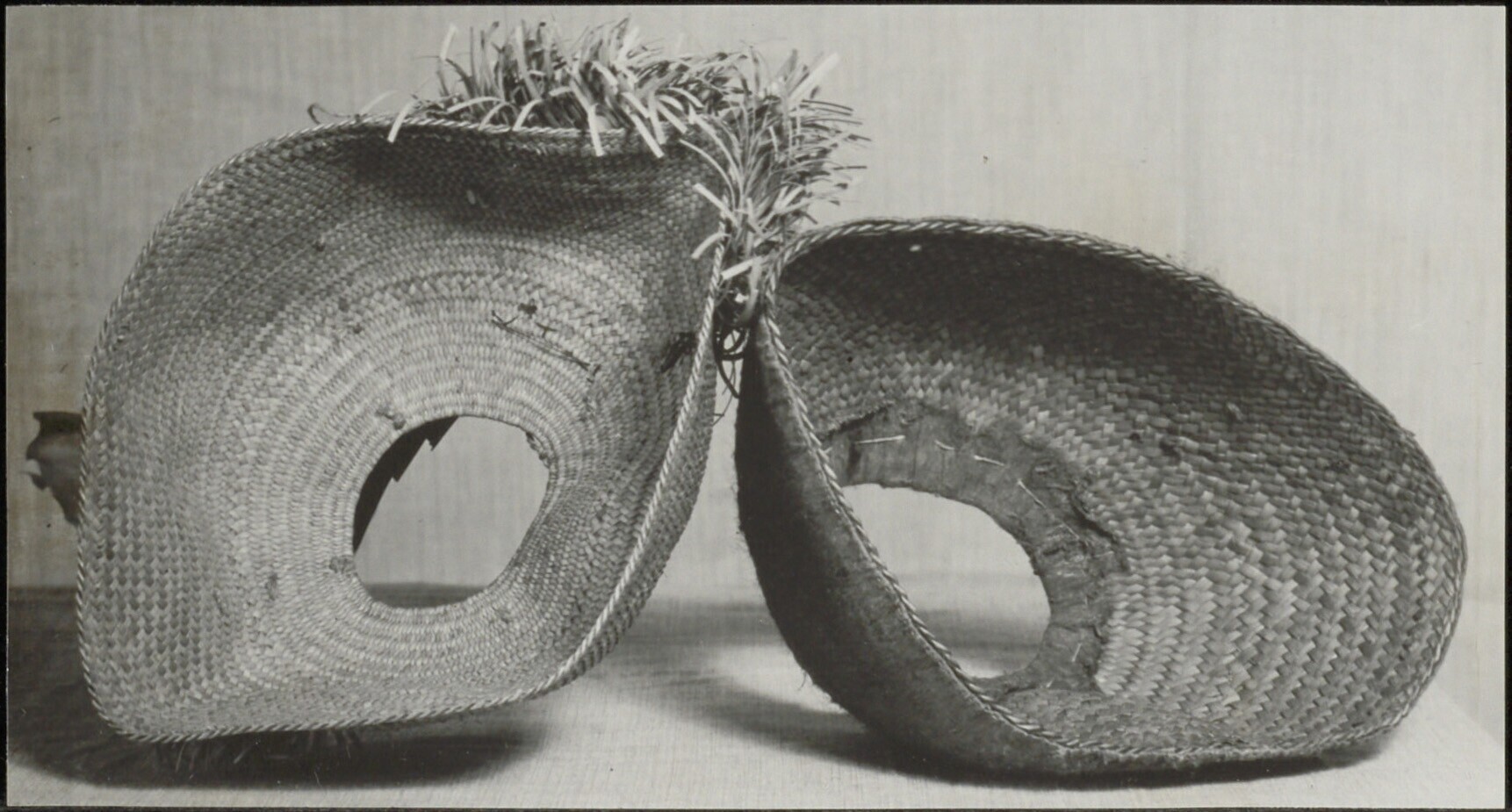 Opname van twee hoofddeksels met een opening aan de bovenzijde, gezien naar de binnenzijde