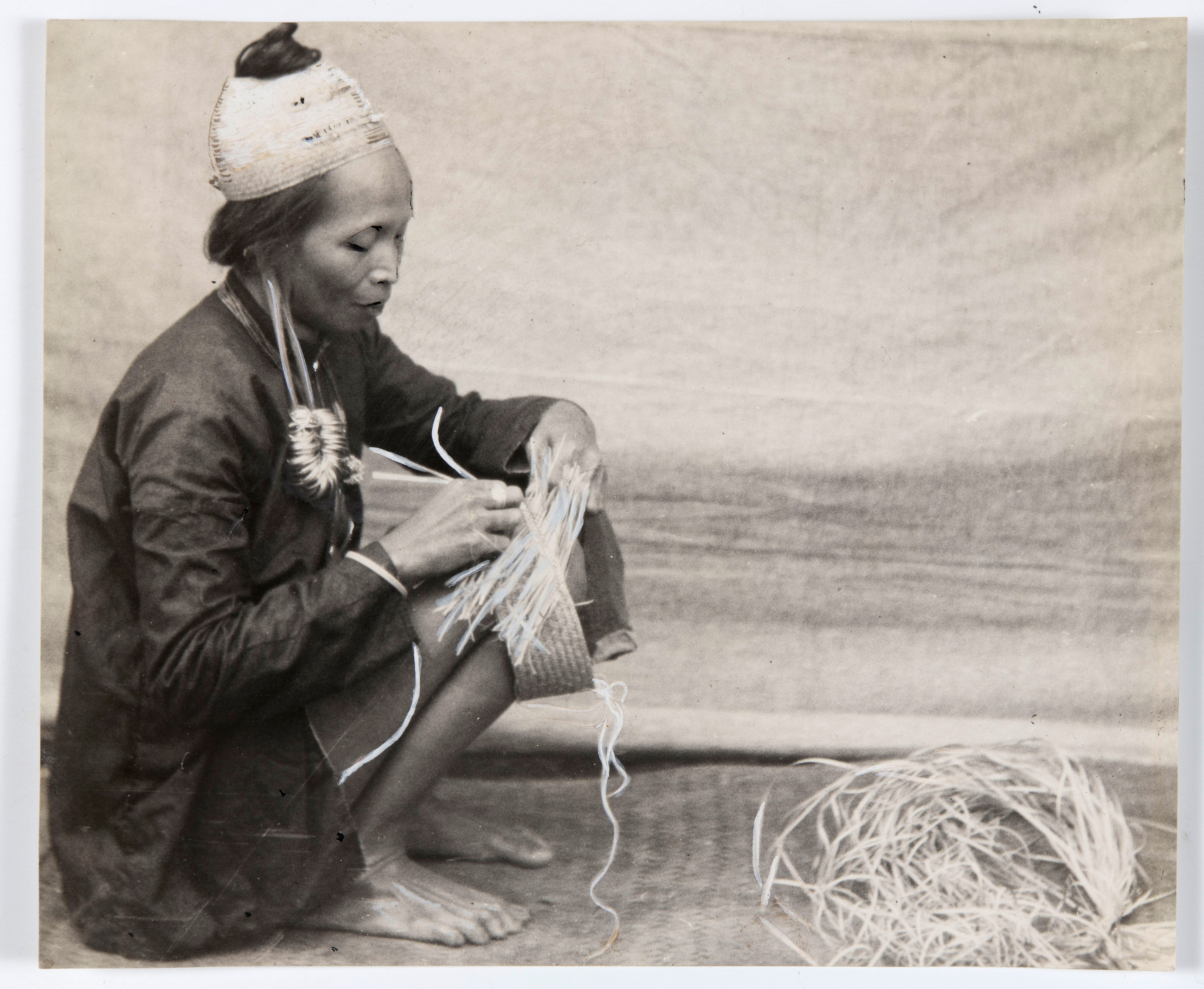 Portret van een gehurkt zittende hoofdbandvlechtster aan het werk