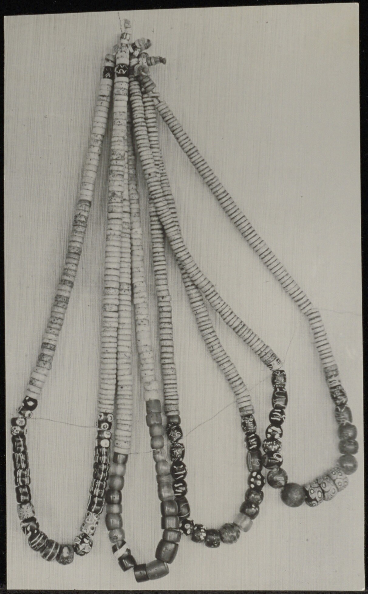 Vier kettingen van kralen in verschillend formaat en kleur