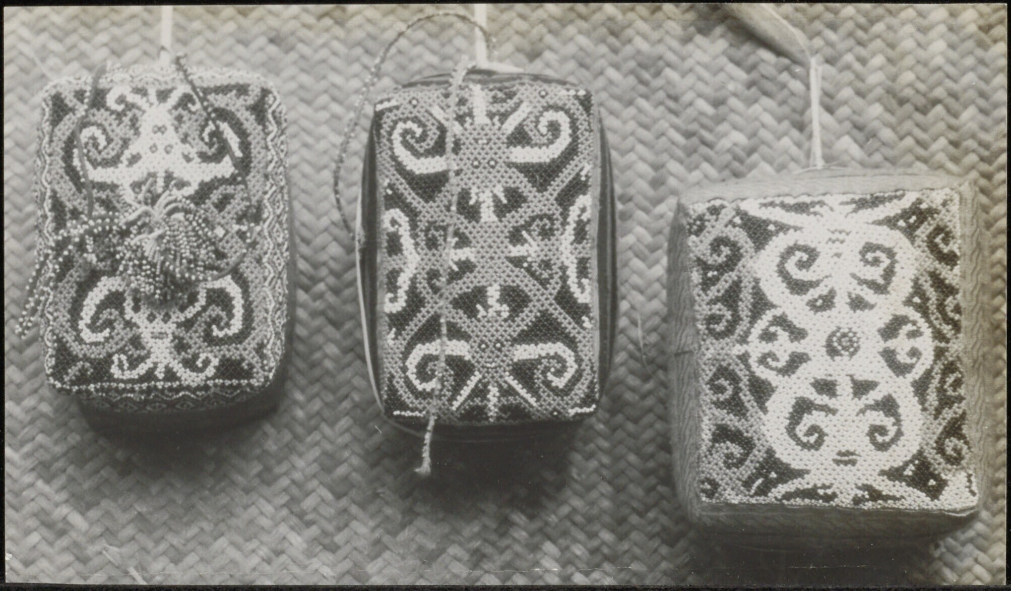 Drie verschillende doosjes van vlechtwerk met een deksel versierd met een in kralen opgezet arabesk-patroon