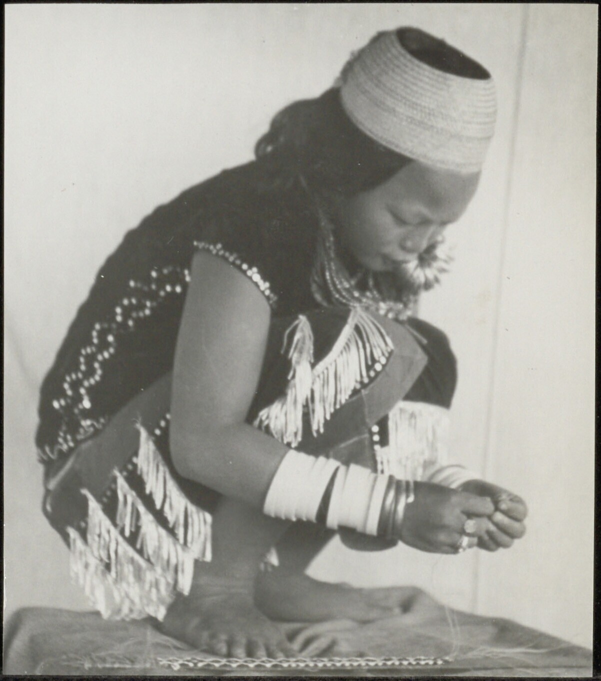 Portret van een gehurkt zittende vrouw bezig met het rijgen van kralen