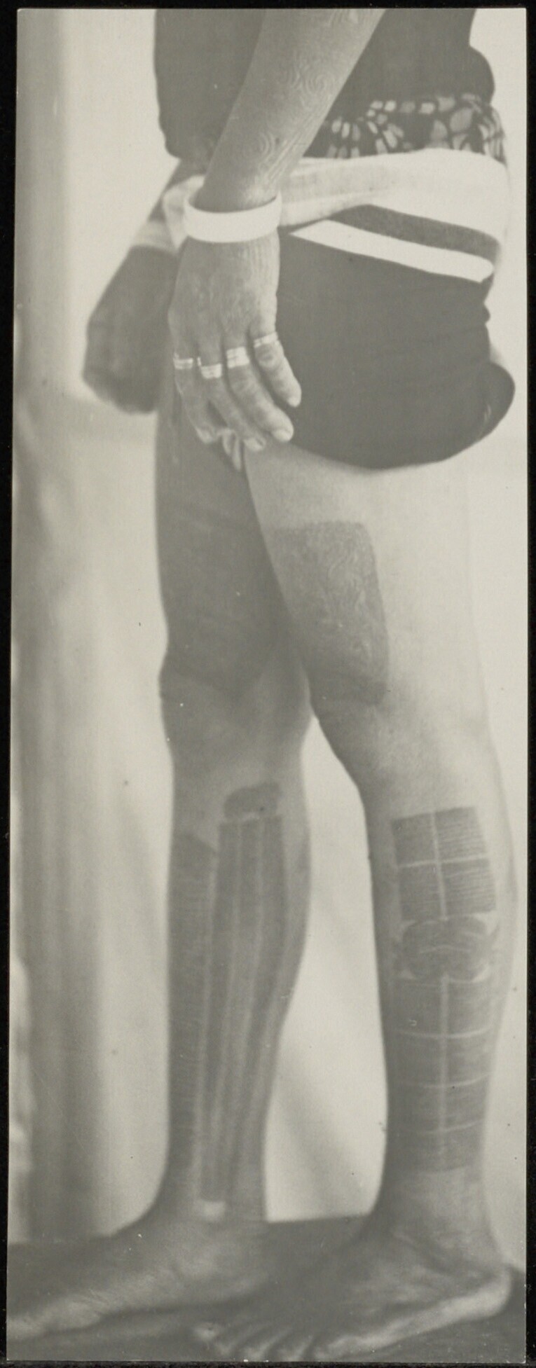 Tatoeages op onderbenen, bovenbenen en voeten, gezien van opzij