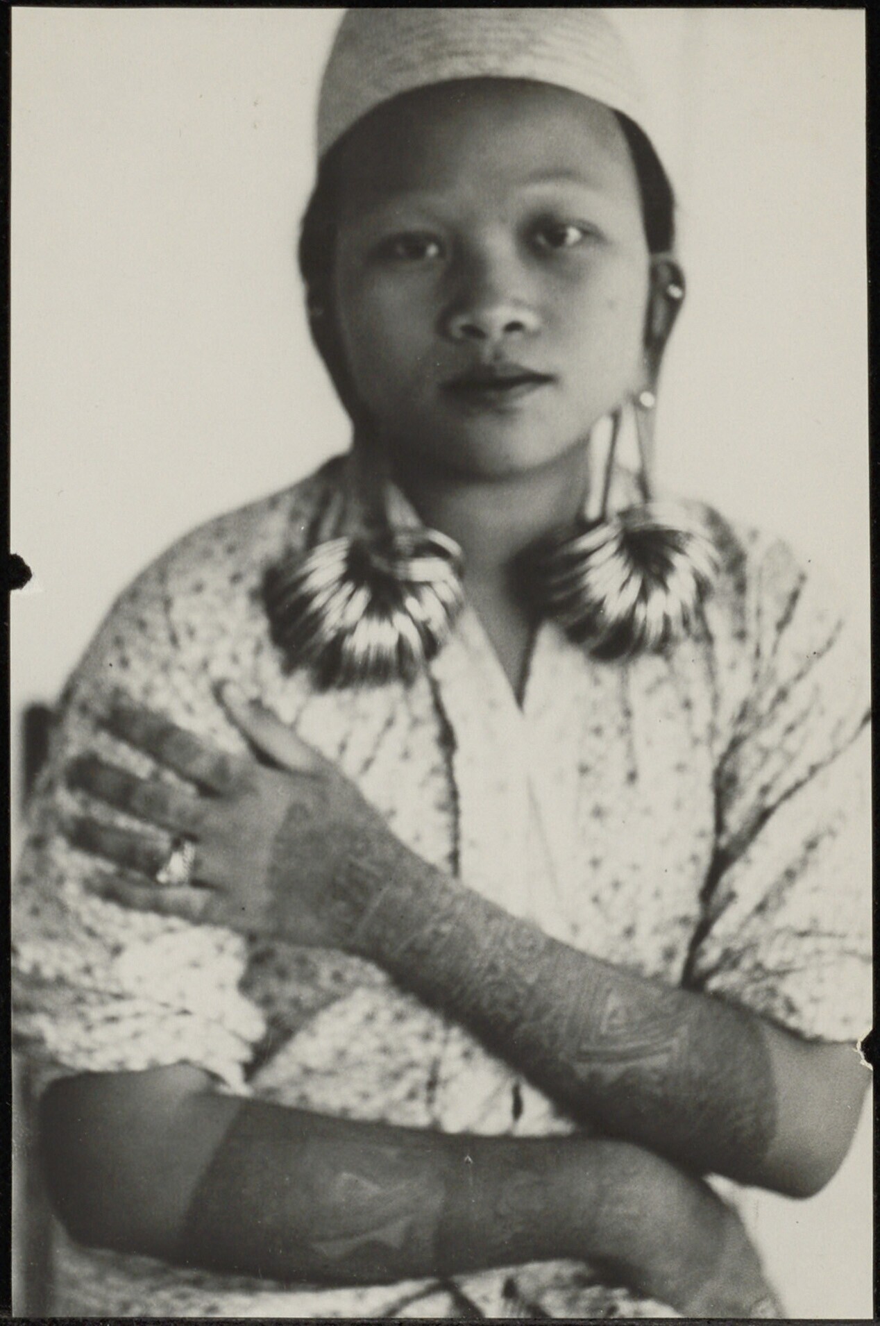 Portret van een vrouw met rijkelijk getatoeëerde onderarmen en handen