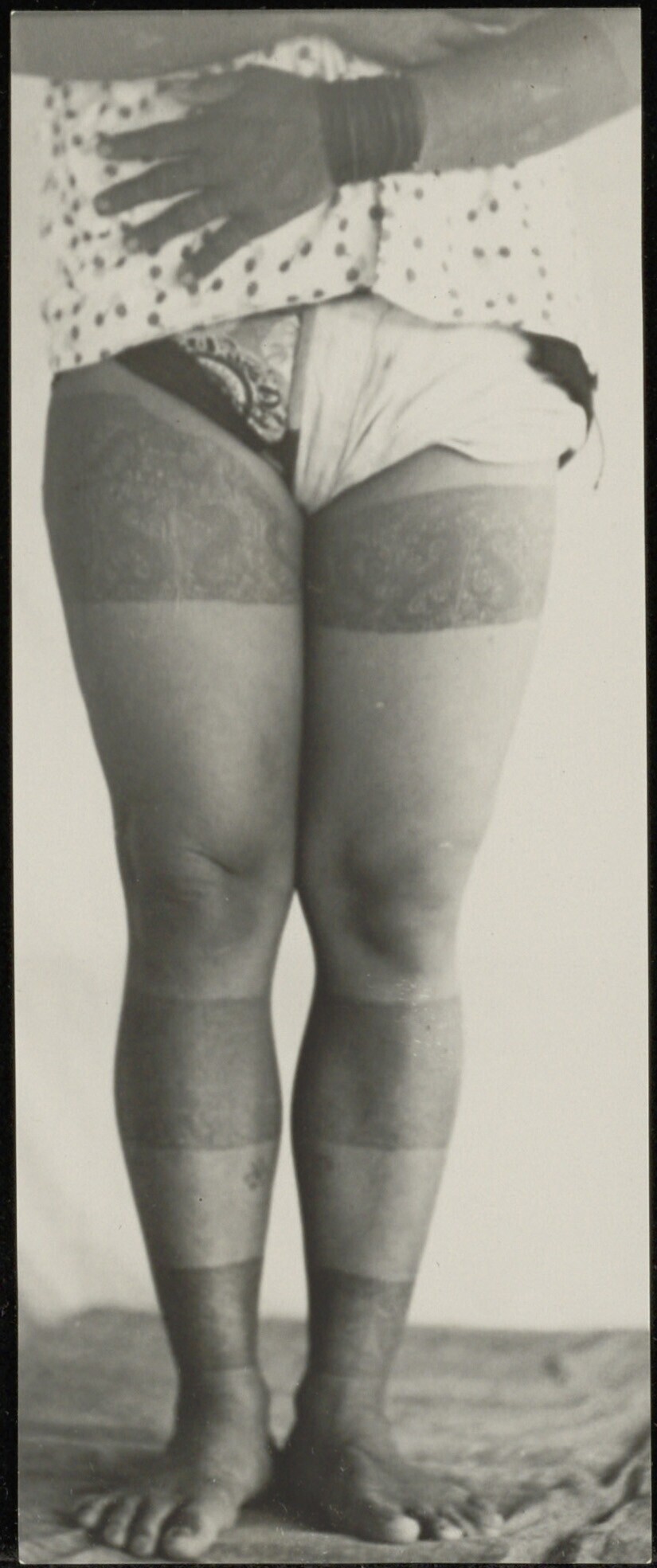 Tatoeages op onder- en bovenbenen en voeten, van voor gezien