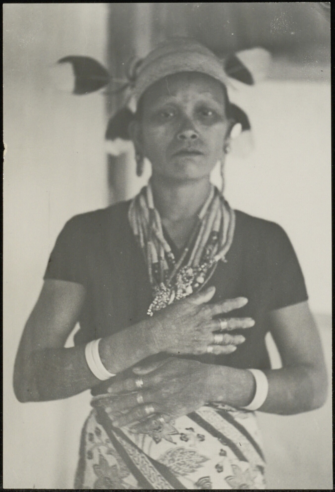 Portret van een vrouw die haar getatoeëerde armen en handen voor haar borst houdt.