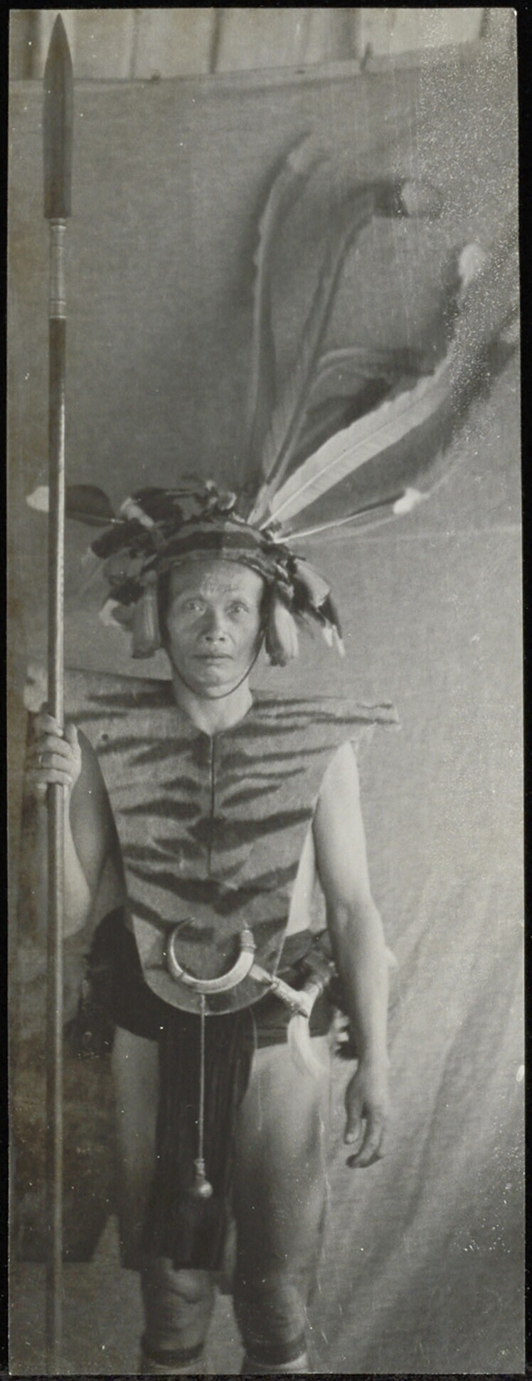 Portret van een zoon van Taman Kila met een hoofdtooi van lange veren en een krijsmantel van tijgervel