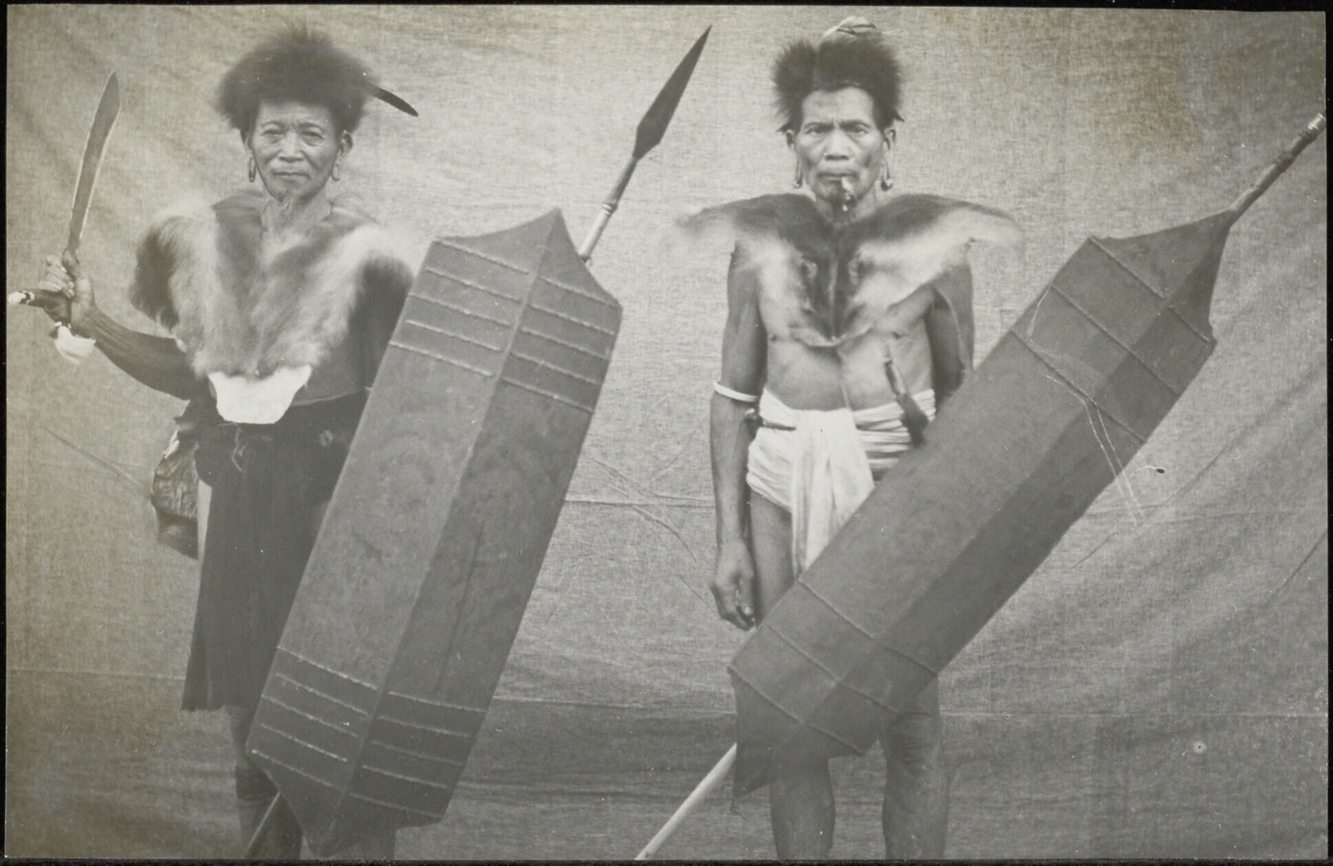 Twee krijgers in vol ornaat met lans, schild en mandau