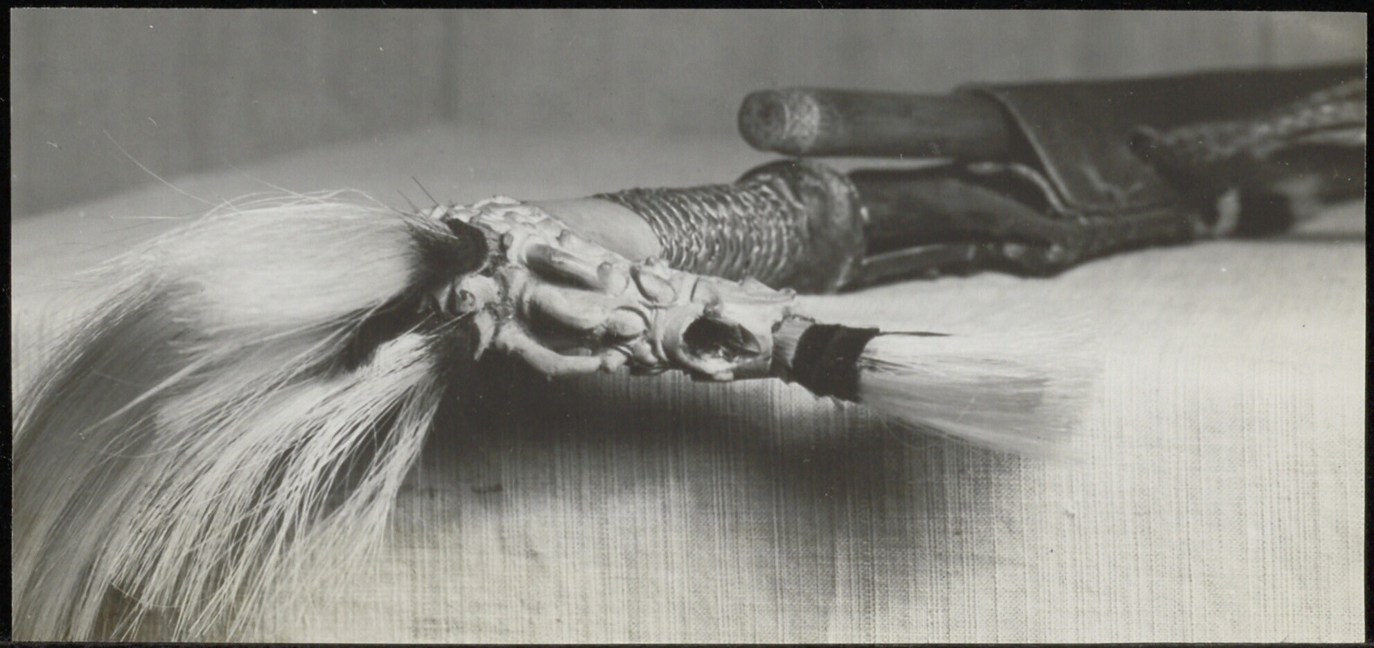 Detail van fijn snijwerk in de ivoren kop van het gevest van een mandau waarbij de kop is versierd is met kwastjes