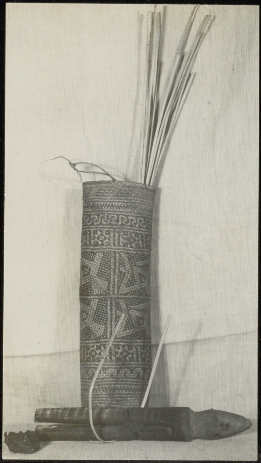 De benodigdheden van de vuurzaag. Koker van vlechtwerk met een decoratief patroon gevlochten in een contrasterende kleur