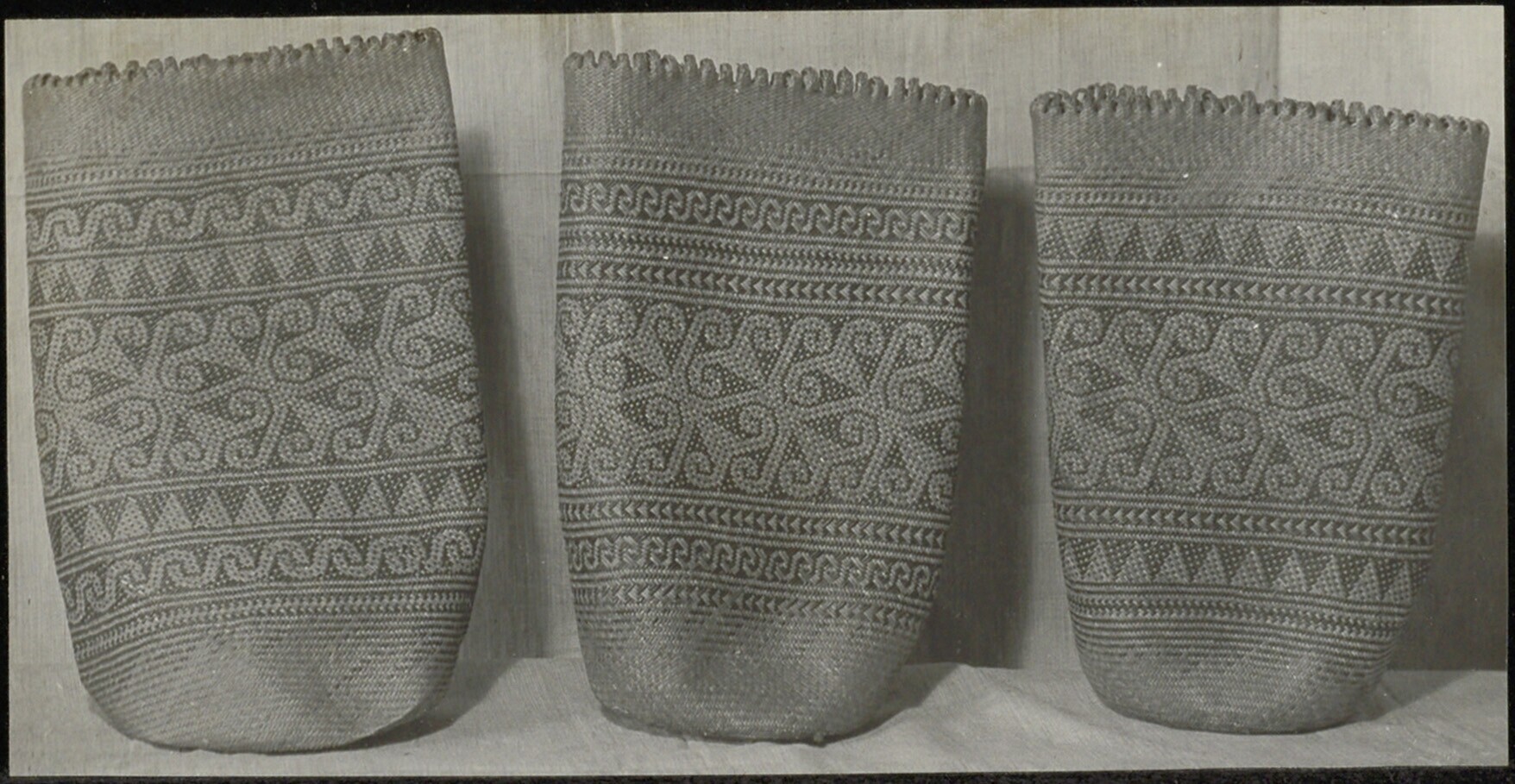 Drie gevlochten manden met in het vlechtwerk een decoratief patroon in een contrasterende kleur