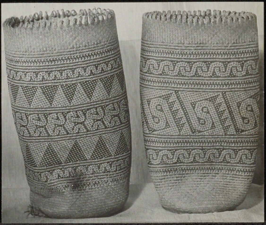 Twee gevlochten manden met een decoratief patroon in een contrasterende kleur