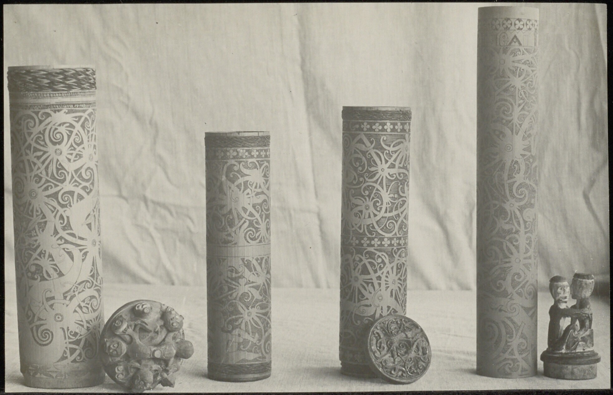 Vier bewerkte bamboekokers waarvan er drie zijn afgebeeld met bijbehorende versierde deksels