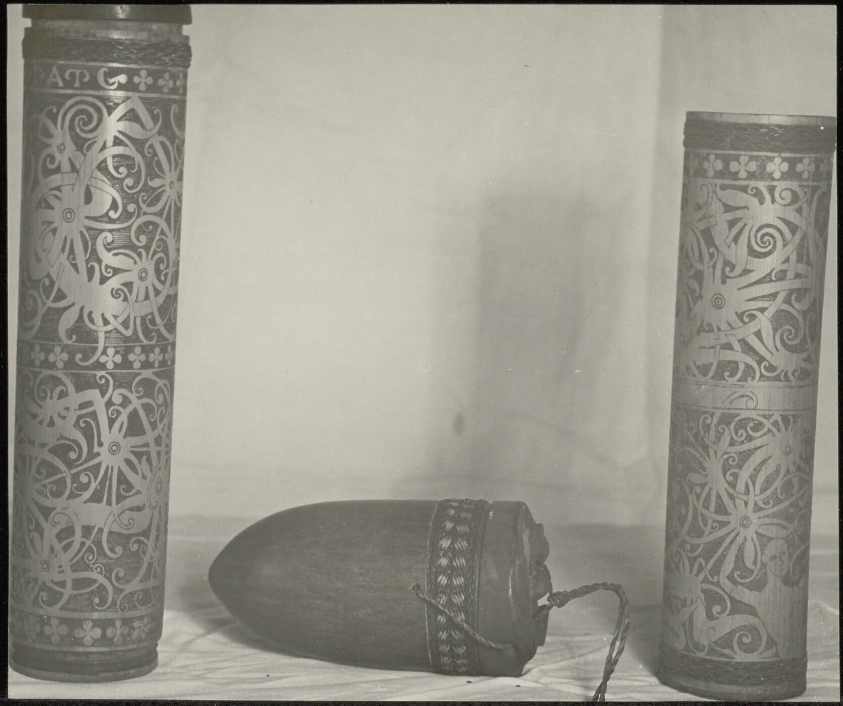 Twee bewerkte bamboekokers met traditionele uitgesnlen motieven en een tolvormig voorwerp met een gevlochten band