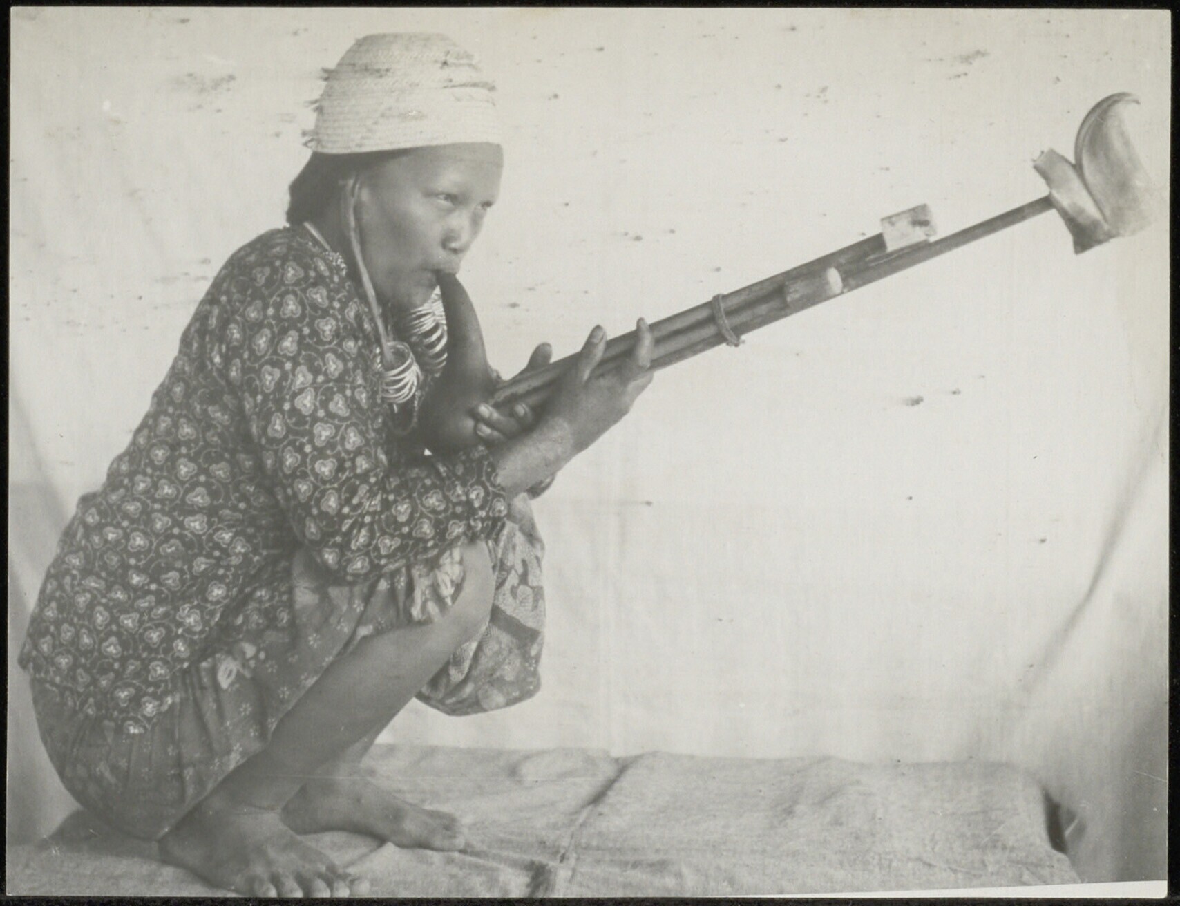 Gehurkt zittende vrouw met een traditioneel blaasinstrument aan de mond : de kefieree.