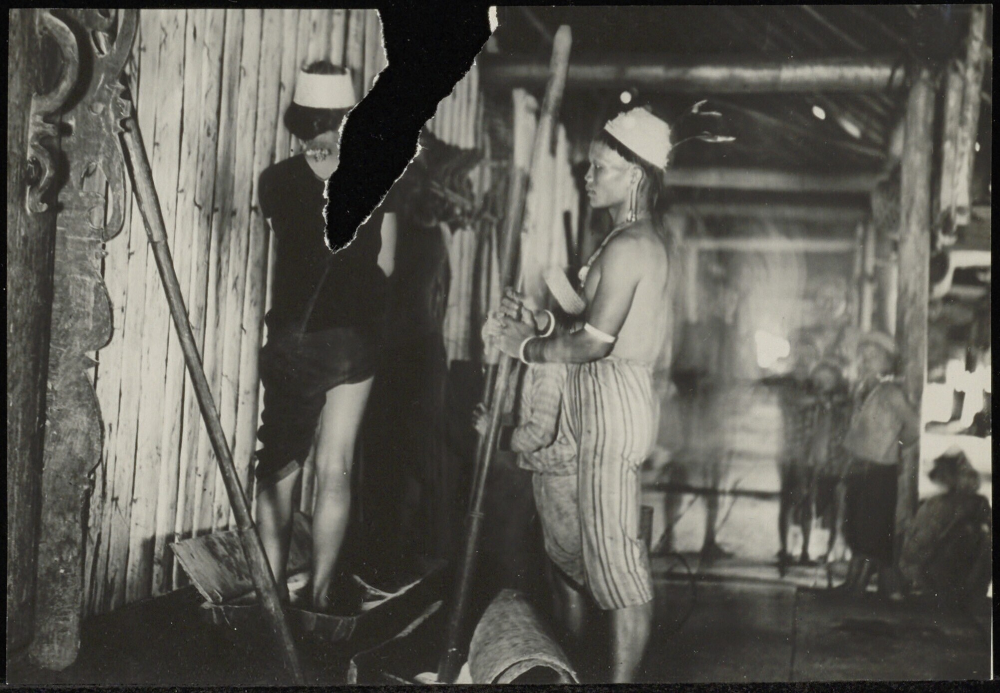 Een man en een vrouw bezig met het stampen van rijst in een rijstblok