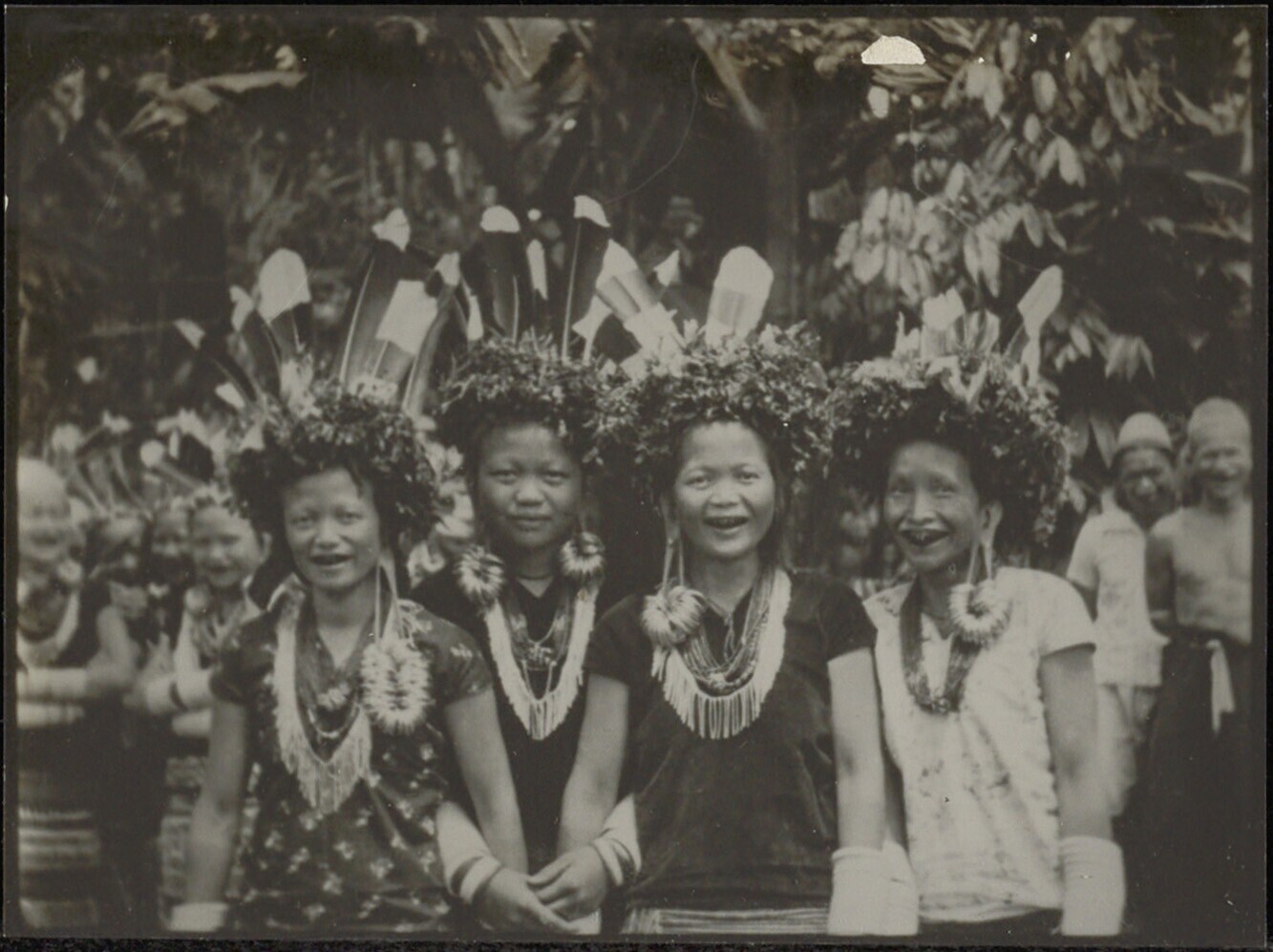 Groepsportret van vier feestelijk uitgedoste jonge vrouwen uit Apo-Kajan