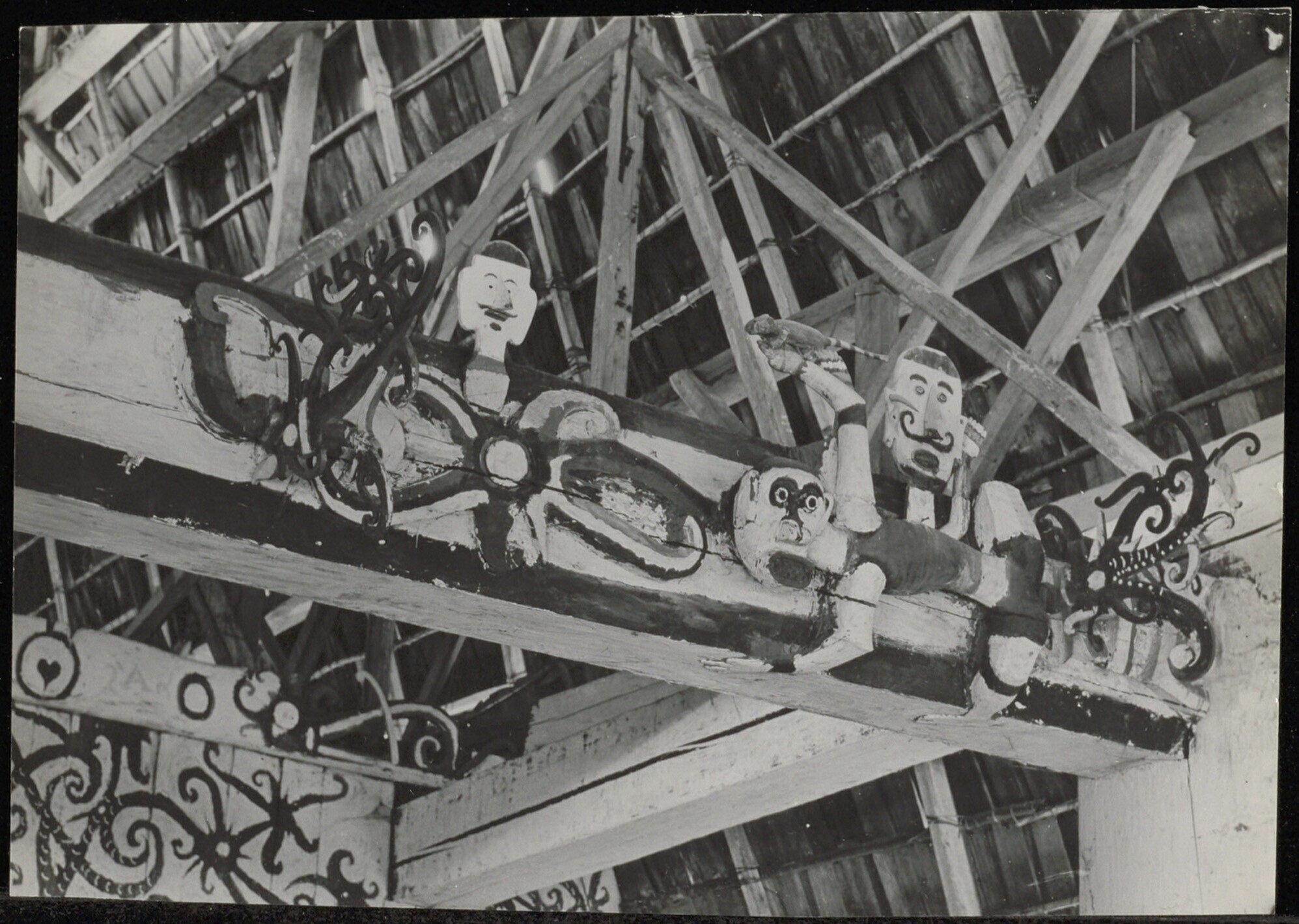 Interieur van een huis met beschilderde sculpturen aan de dakspanten