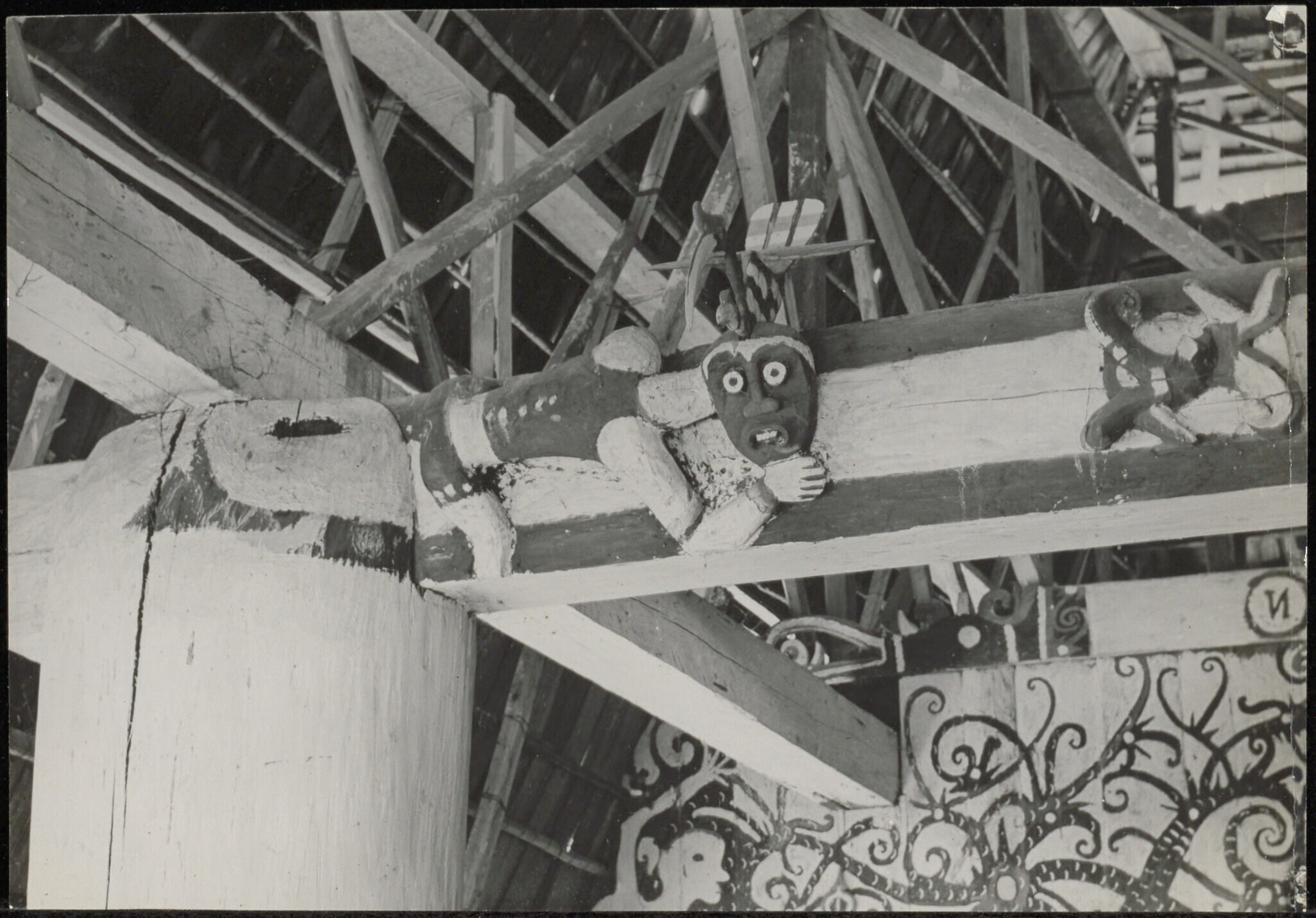 Interieur van een huis met beschilderde sculpturen aan de dakspanten