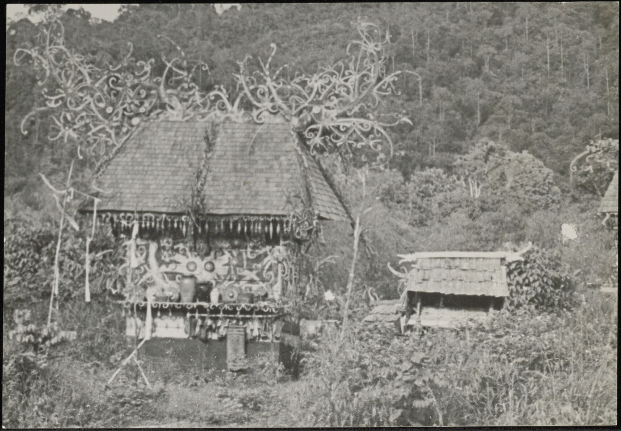 In het open veld staande huisjes op palen voor het bewaren van de as van overledenen