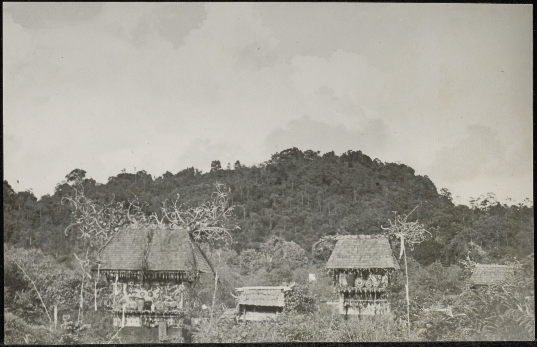 Landschap met huisjes op palen gebruikt voor het bewaren van de as van overledenen