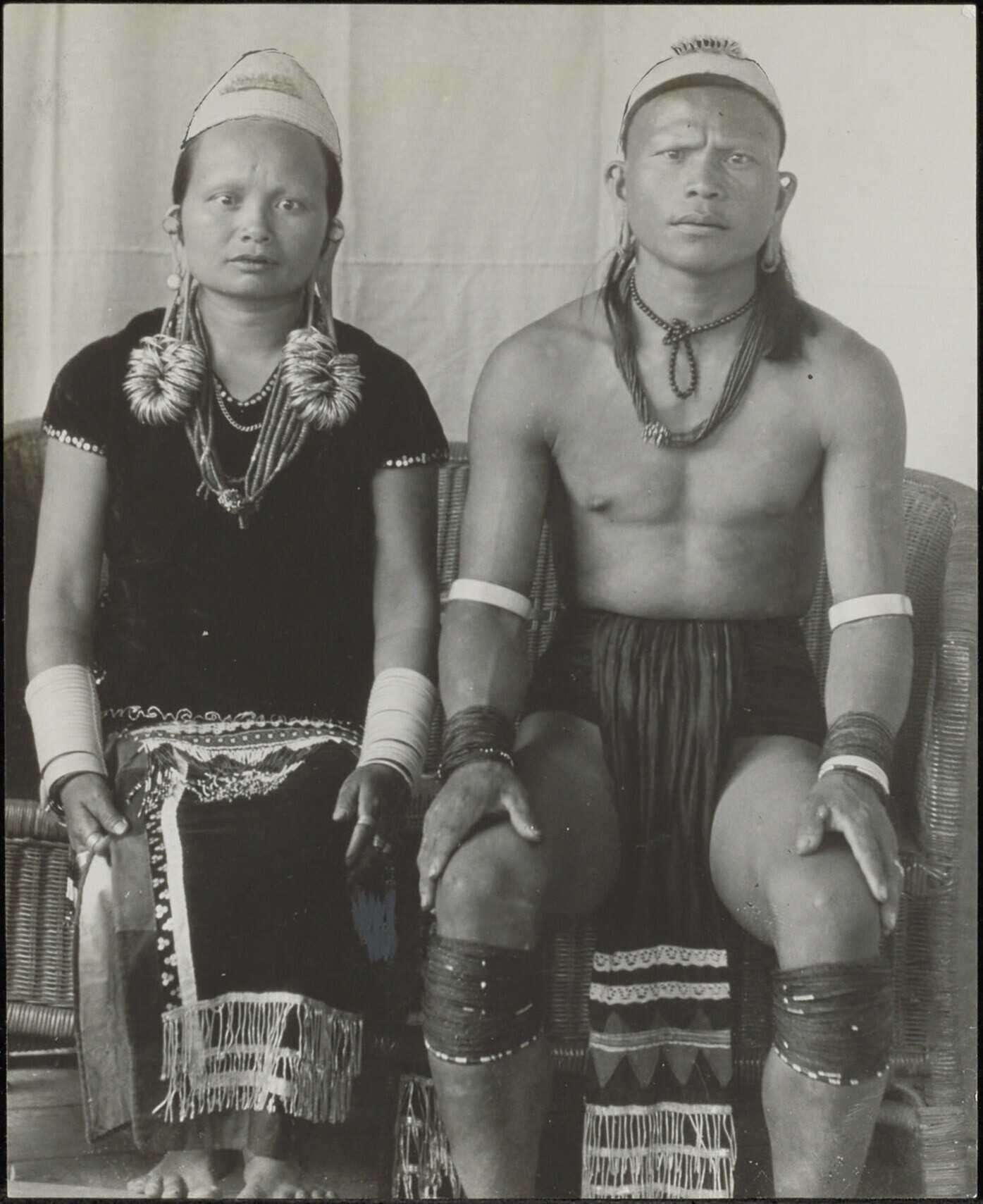 Groepsportret van de Dayak man Taman Katjang met zijn echtgenote, beide in traditionele kleding