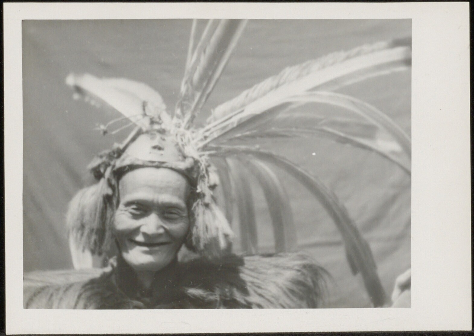 Portret van de opper-priester met een hoofdtooi met lange veren en kwastjes aan de zijkanten