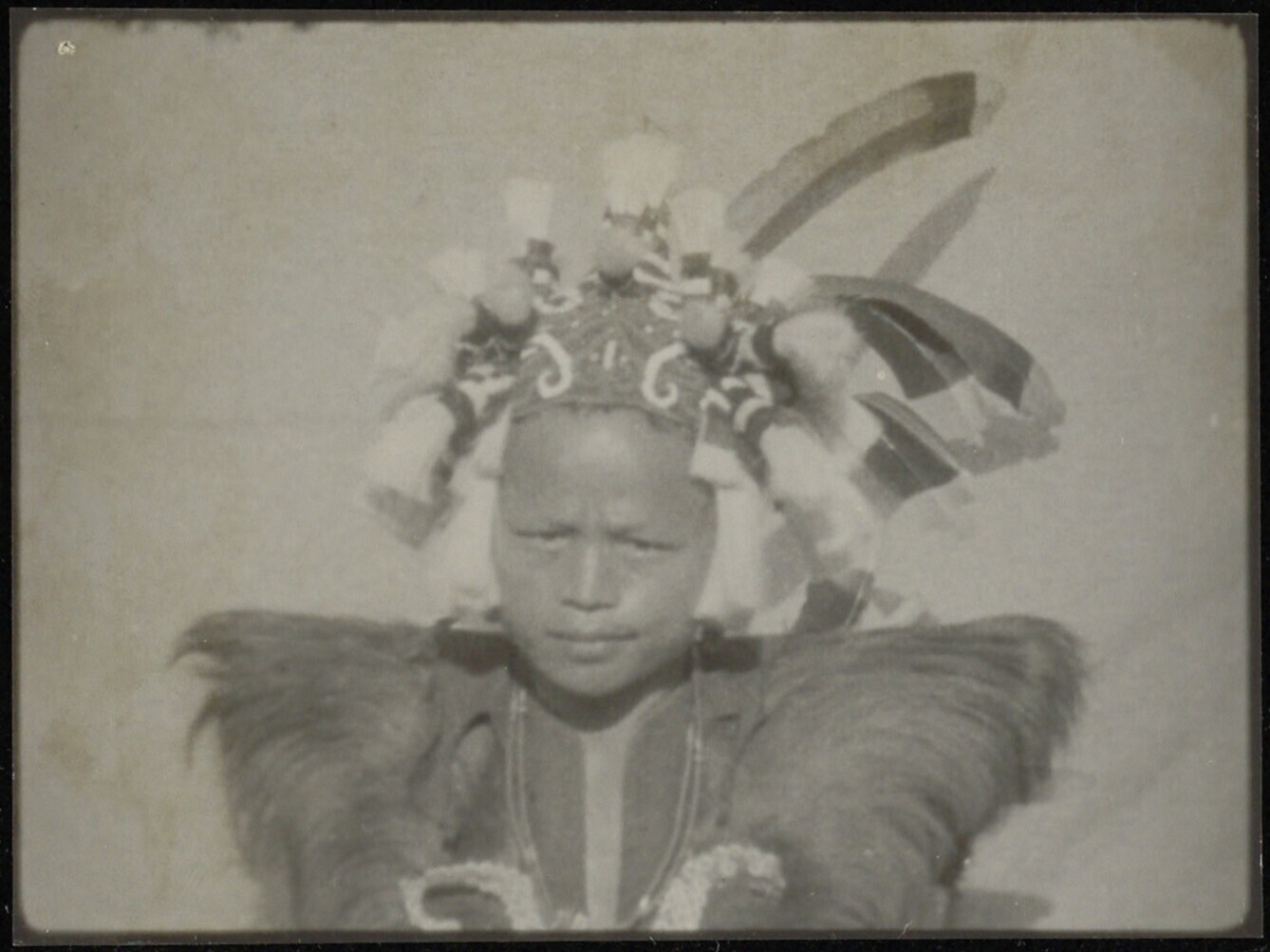 Portret van een jongen met een hoofdtooi versierd met kwastjes en veren