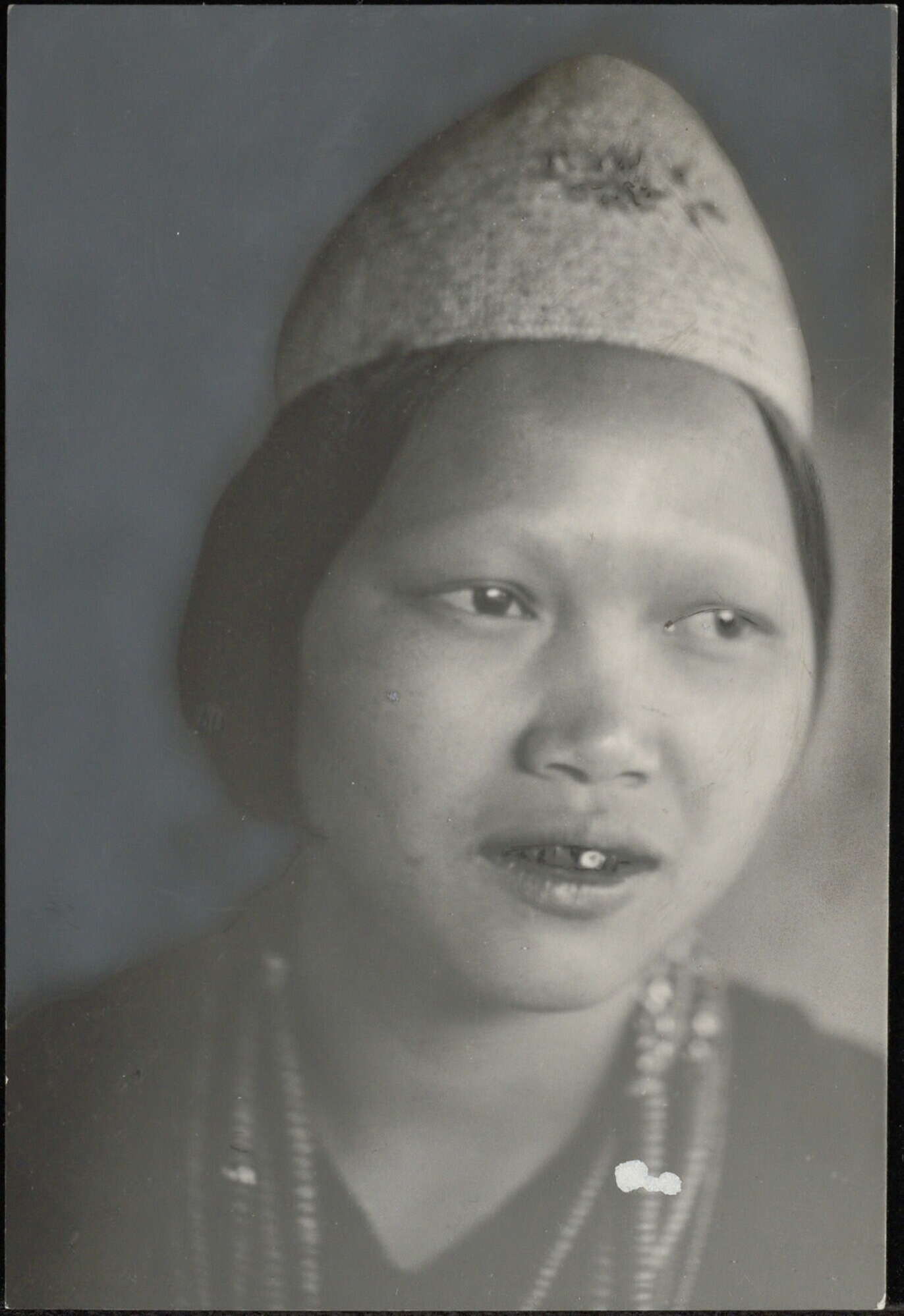 Portret van een jonge Kenyah Dayak vrouw met een gevlochten hoofddeksel