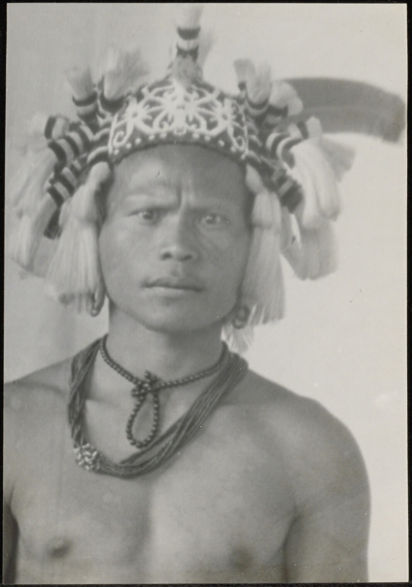 Portret van een man met een hoofdtooi, rijk versierd met kwasten