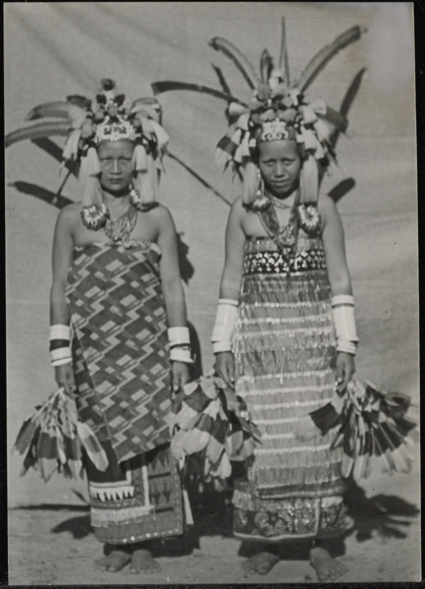 Groepsportret van twee vrouwen uit Nahakramo in feestkleding met een rijk versierde hoofdtooi en vooorwerpen van veren in de hand