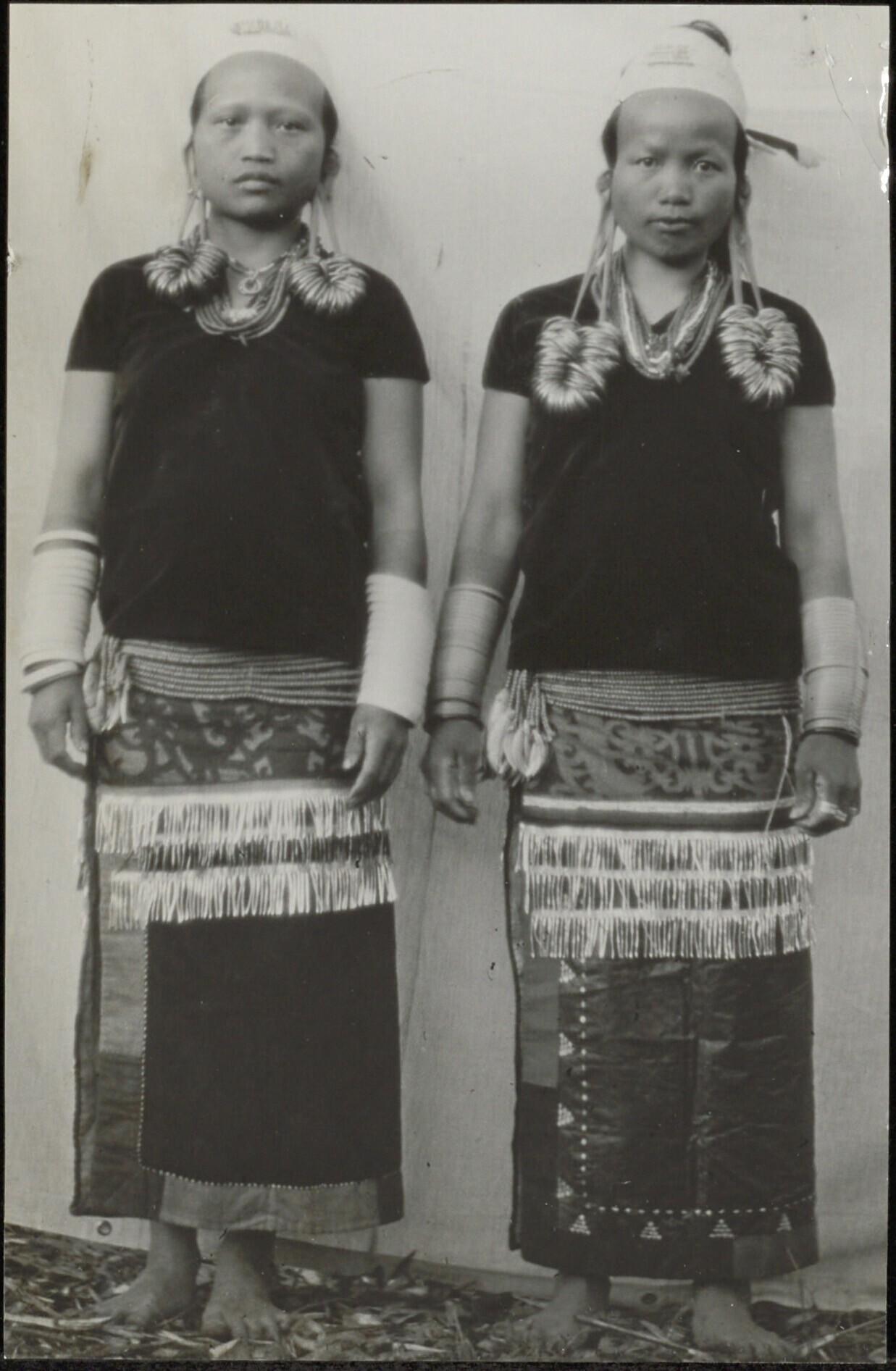 Groepsportret van twee vrouwen in feestelijke kleding, aan oren en armen rijkelijk met ringen behangen