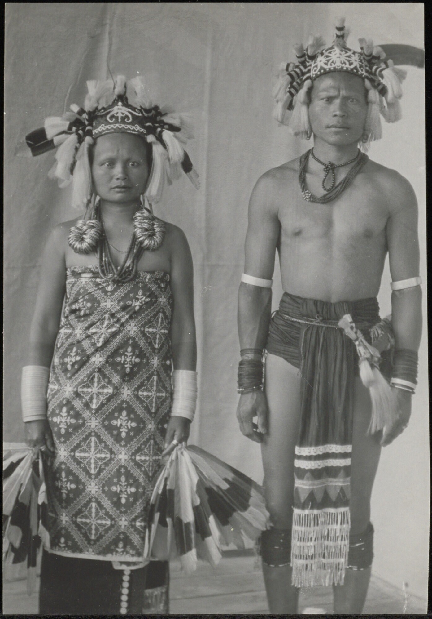 Groepsportret van Taman Katjang en zijn echtgenote in feestelijke traditionele kleding, beide met een met kwasten versierde hoofdtooi