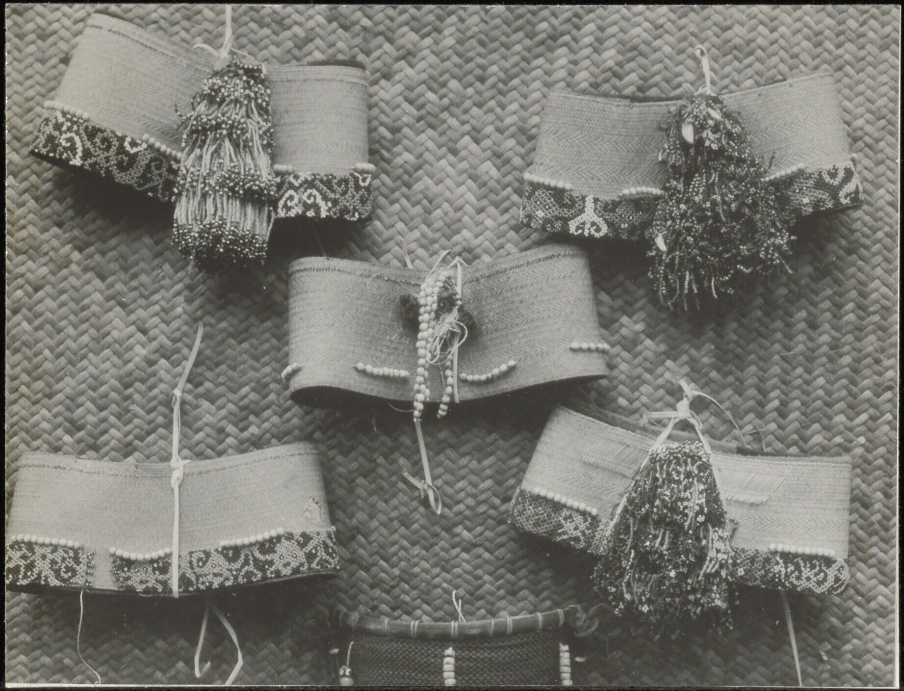 Vijf verschillende hoofdbanden met uiteenlopende versiering van kralen en franje